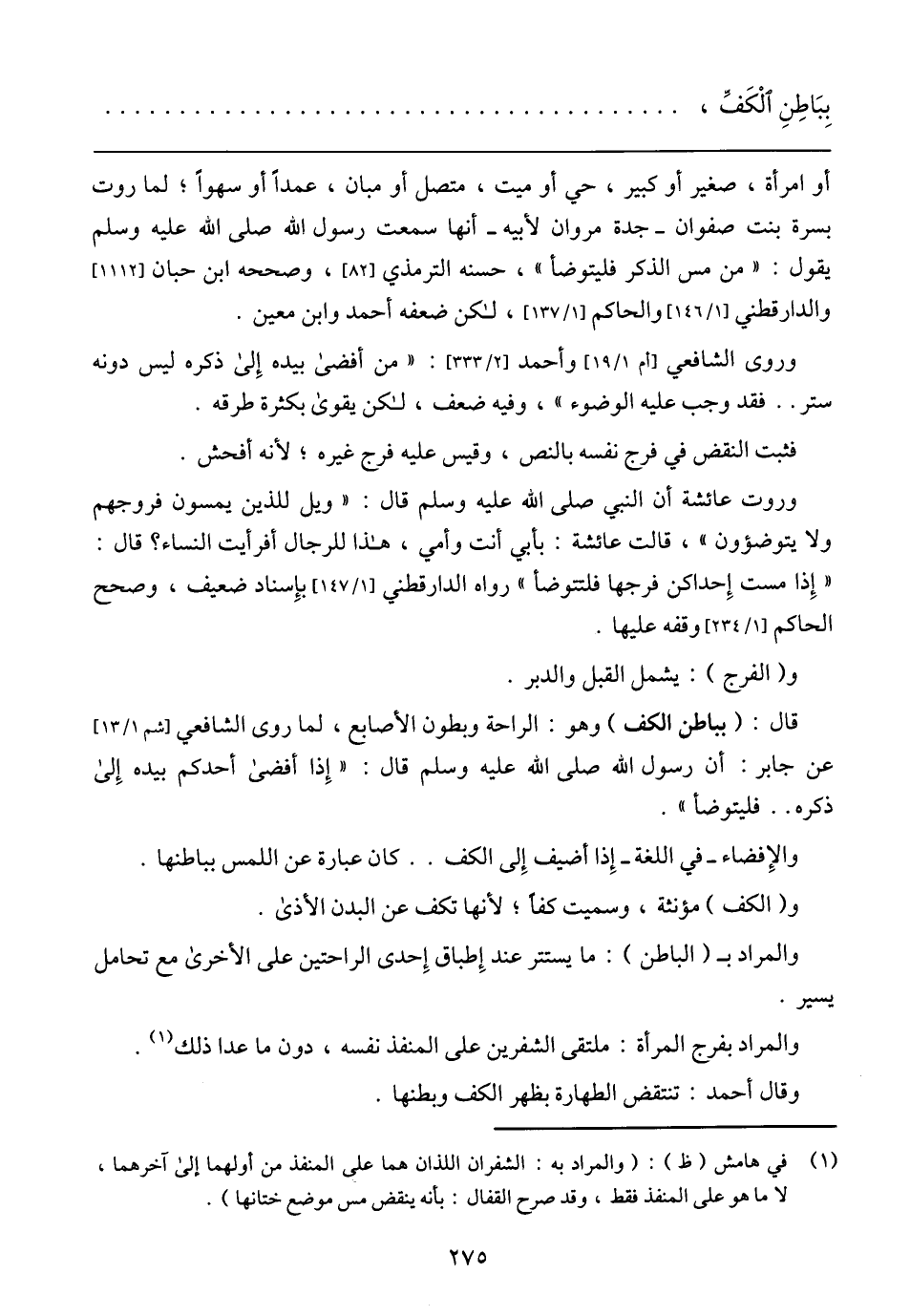 قال: (بباطن الكف) وهو: الراحة وبطون الأصابع، لما روى الشافعي [شم 1/ 13] عن جابر: أن رسول الله صلى الله عليه وسلم قال: (إذا أفضى أحدكم بيده إلى ذكره .. فليتوضأ).