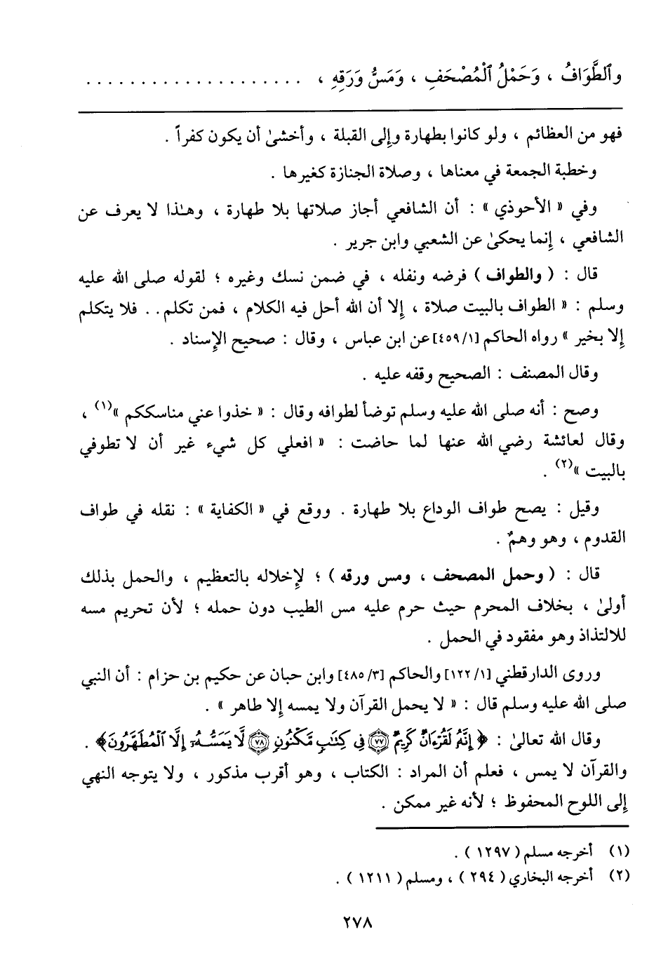 واَلطَّوَافُ، وَحَمْلُ اَلْمُصْحَفِ، وَمَسُّ وَرَقِهِ،