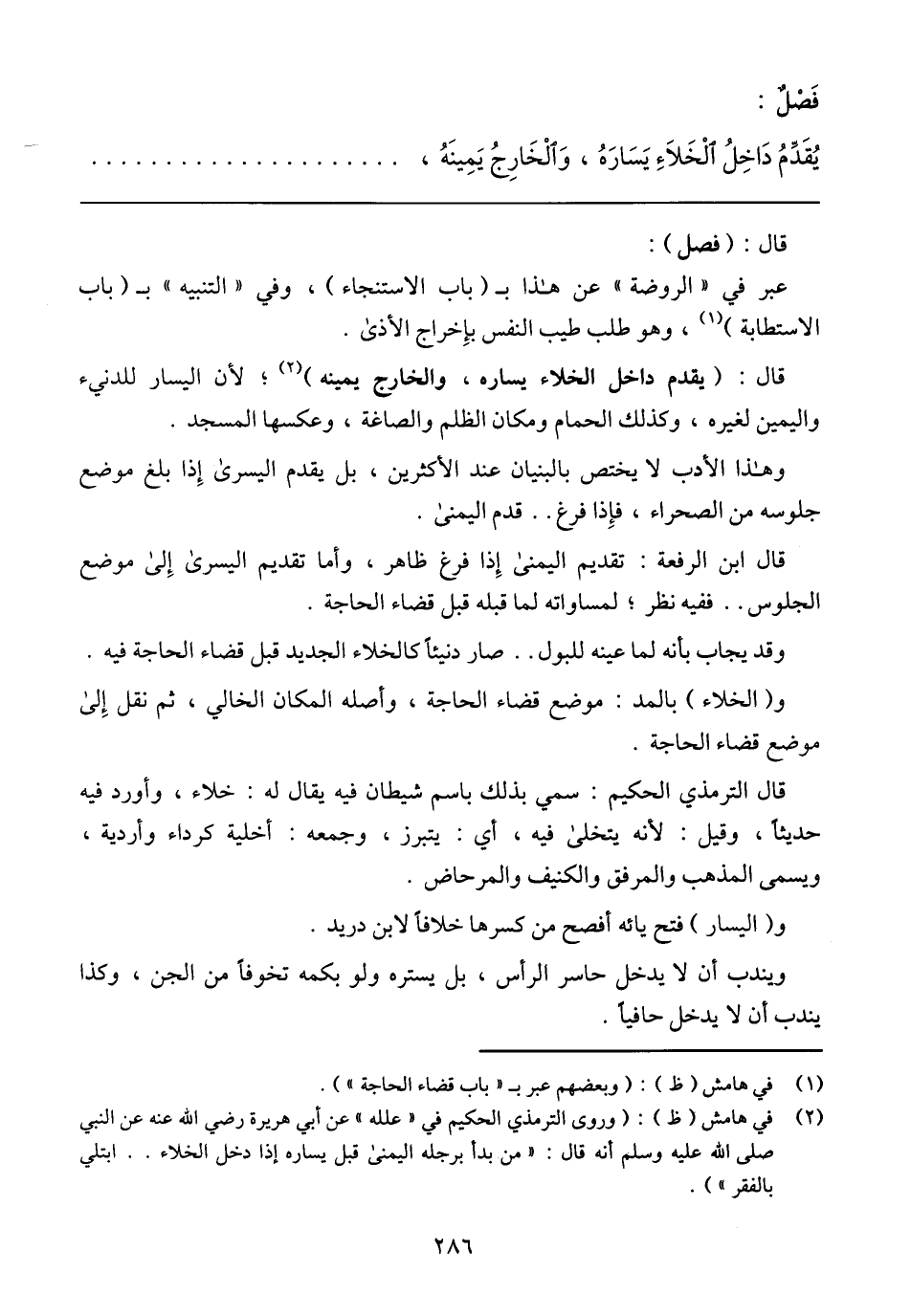 يُقَدَّمُ دَاخِلُ اَلْخَلاَءِ يَسَارَهُ، وَاَلْخَارِجُ يَمِينَهُ،