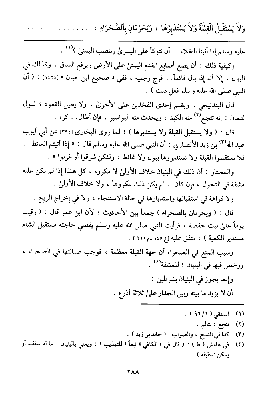 وسبب المنع في الصحراء أن جهة القبلة معظمة، فوجب صيانتها في الصحراء، ورخص فيها في البنيان؛ للمشقة.