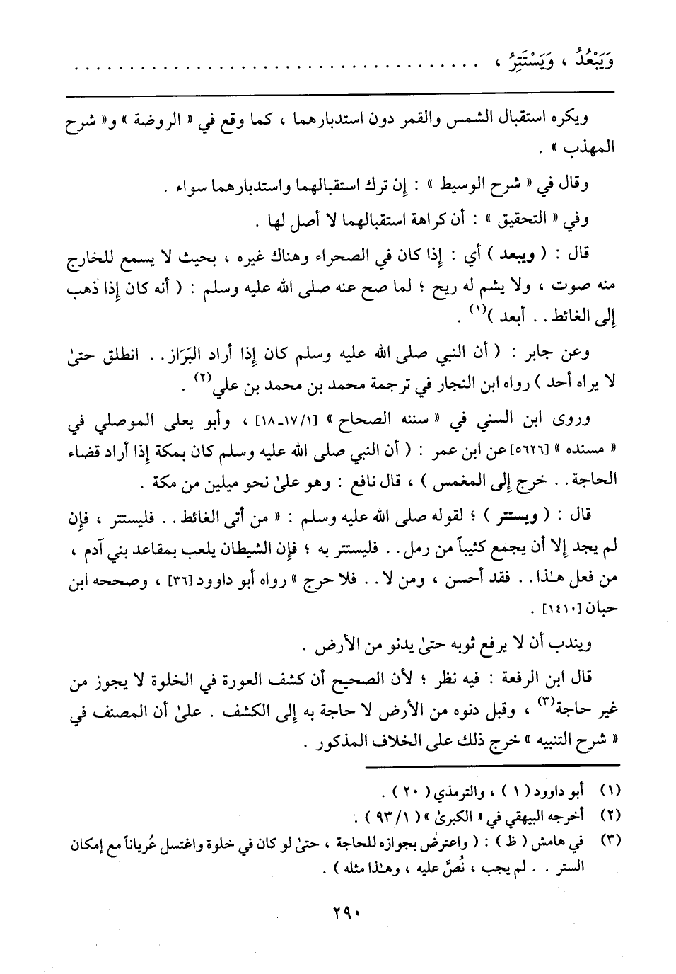 وعن جابر: (أن النبي صلى الله عليه وسلم كان إذا أراد البراز .. انطلق حتى لا يراه أحد) رواه ابن النجار في ترجمة محمد بن محمد بن علي.