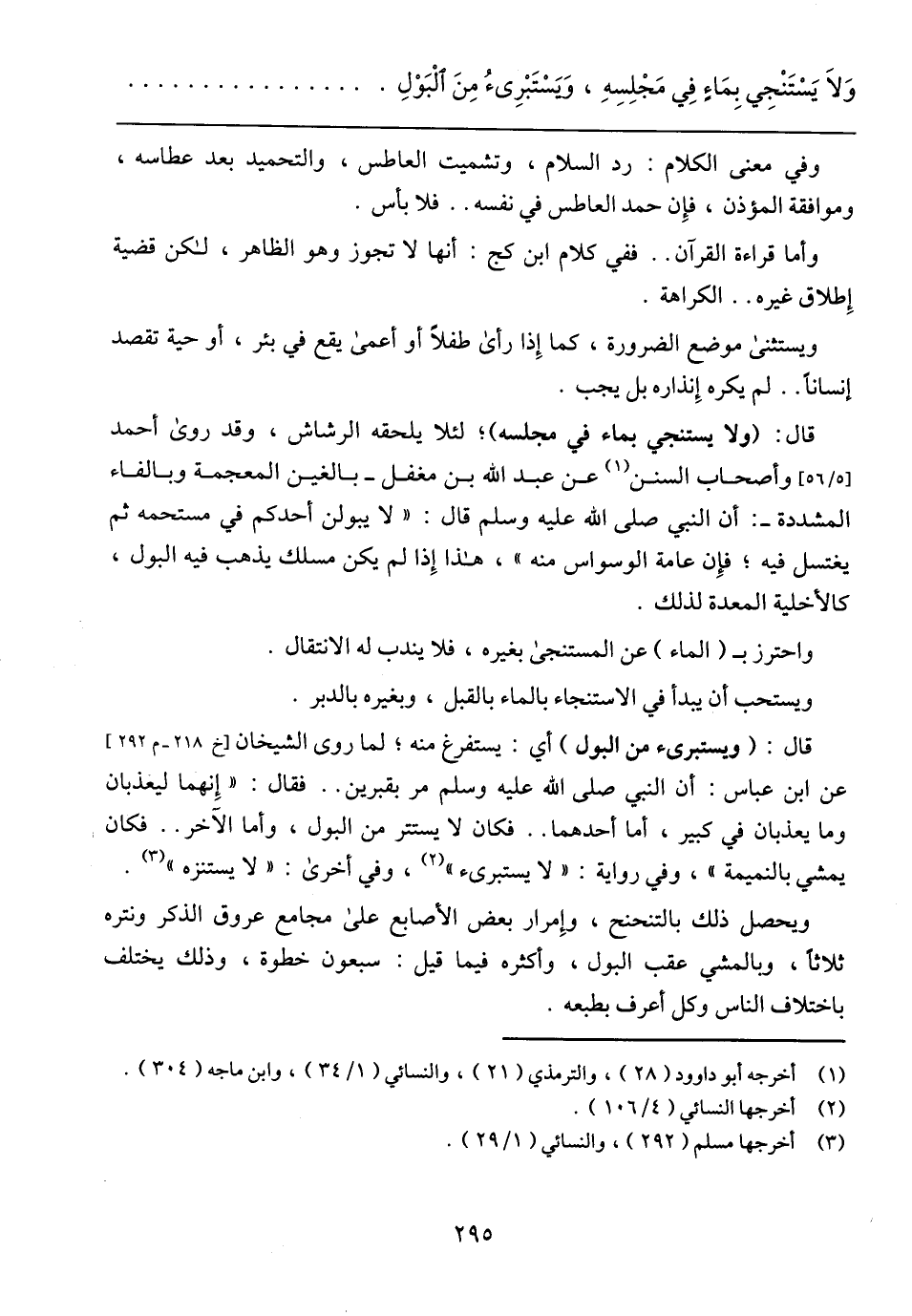 قال: (ولا يستنجي بماء في مجلسه)؛ لئلا يلحقه الرشاش، وقد روى أحمد [5/ 56] وأصحاب السنن عن عبد الله بن مغفل – بالغين المعجمة وبالفاء المشددة -: أن النبي صلى الله عليه وسلم قال: (لا يبولن أحدكم في مستحمه ثم يغتسل فيه؛ فإن عامة الوسواس منه)، هذا إذا لم يكن مسلك يذهب فيه البول، كالأخلية المعدة لذلك.