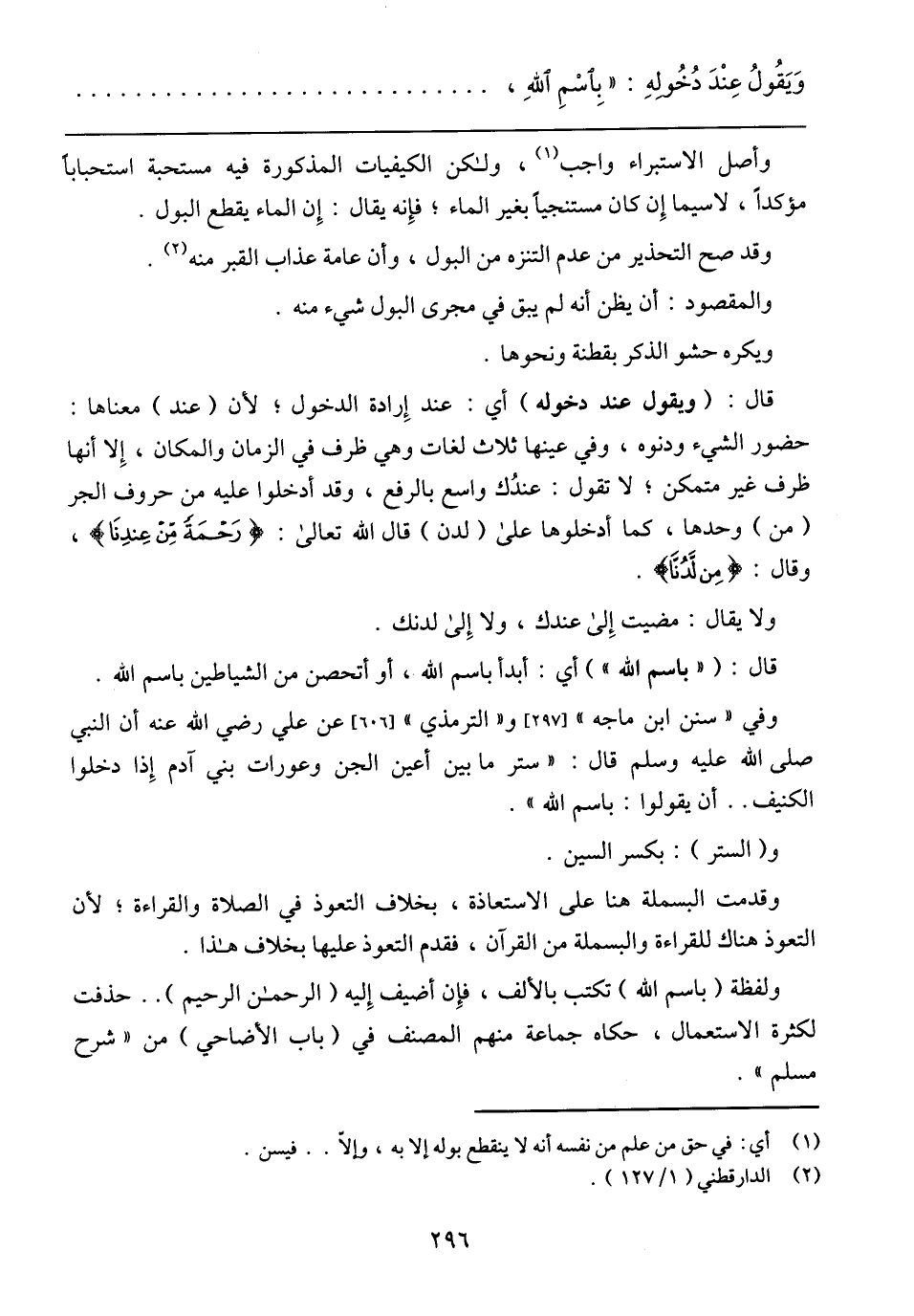 قال: (ويقول عند دخوله) أي: عند إرادة الدخول؛ لأن (عند) معناها: حضور الشيء ودنوه، وفي عينها ثلاث لغات وهي ظرف في الزمان والمكان، إلا أنها ظرف غير متمكن؛ لا تقول: عندك واسع بالرفع، وقد أدخلوا عليه من حرف الجر (من) وحدها، كما أدخلوا على (لدن) قال الله تعالى: {رَحْمَةً مِّنْ عِندِنَا}، وقال: {مِن لَّدُنَّا}.