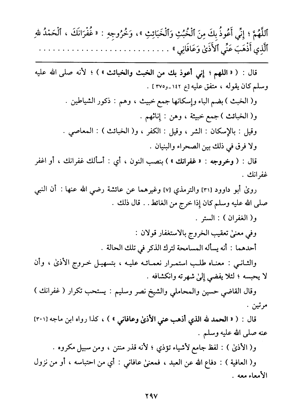 قال: (وخروجه: (غفرانك)) بنصب النون، أي: أسألك غفرانك، أو اغفر غفرانك.