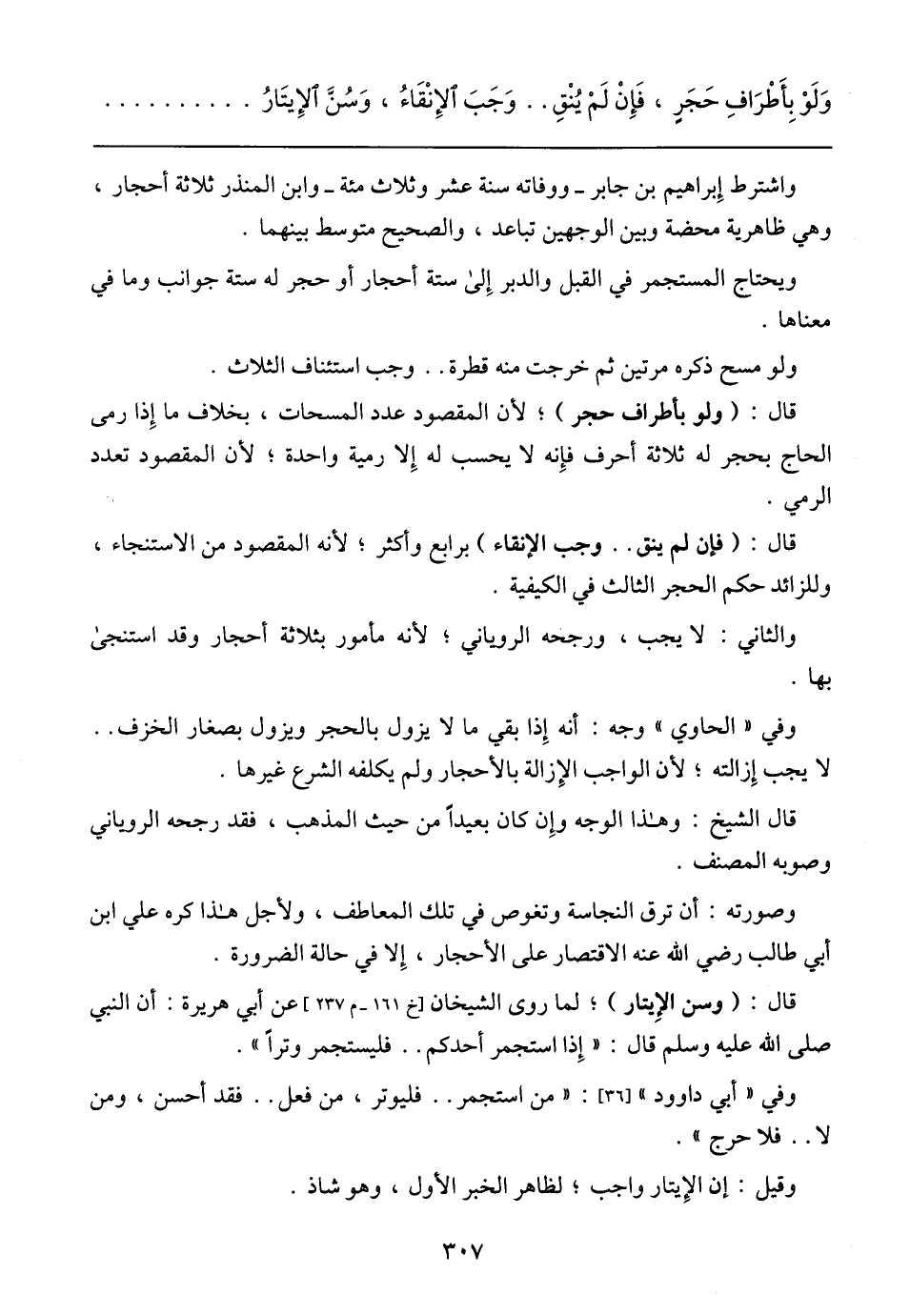 واشترط إبراهيم بن جابر – ووفاته سنة عشر وثلاث مئة – وابن المنذر ثلاثة أحجار، وهي ظاهرية محضة وبين الوجهين تباعد، والصحيح متوسط بينهما.