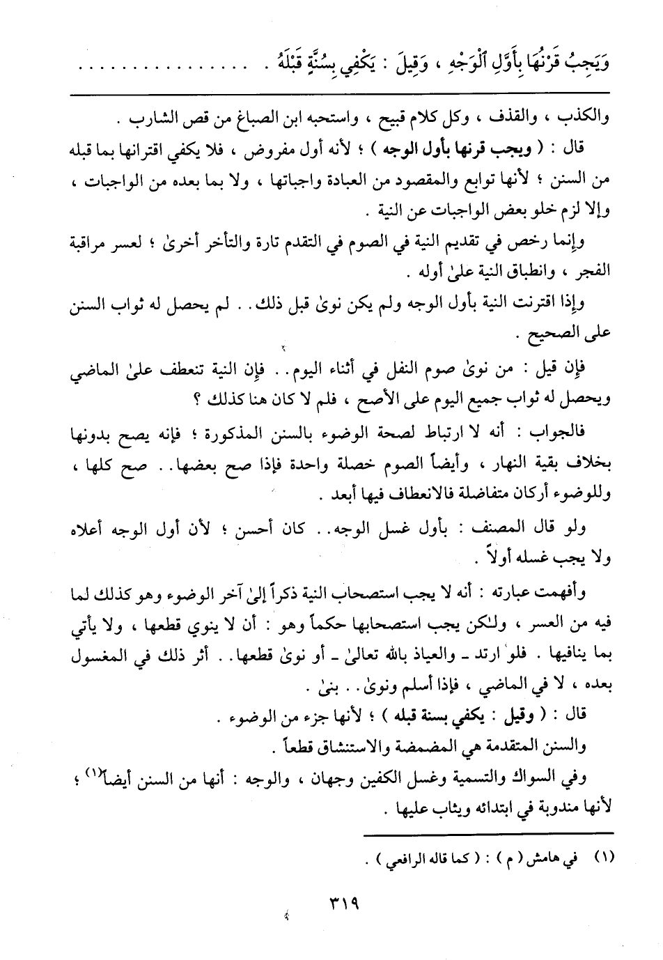 وأفهمت عبارته: أنه لا يجب استصحاب النية ذكراً إلى آخر الوضوء وهو كذلك لما فيه من العسر، ولكن يجب استصحابها حكماً وهو: أن لا ينوي قطعها، ولا يأتي بما ينافيها. فلو ارتد – والعياذ بالله تعالى – أو نوى قطعها .. أثر ذلك في المغسول بعده، لا في الماضي، فإذا أسلم ونوى .. بنى.