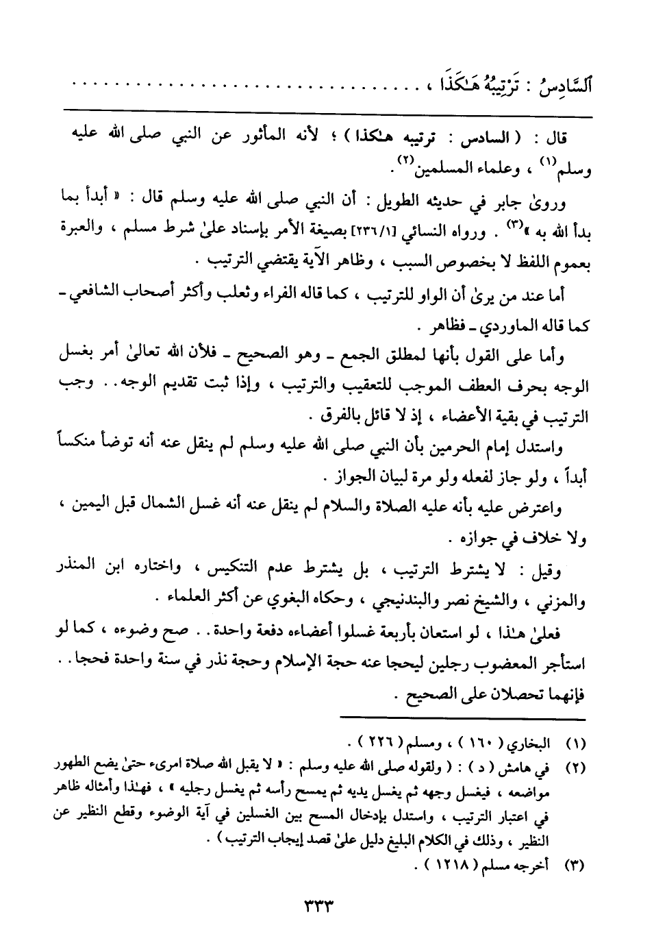 قال: (السادس: ترتيبه هكذا)؛ لأنه المأثور عن النبي صلى الله عليه وسلم، وعلماء المسلمين.
