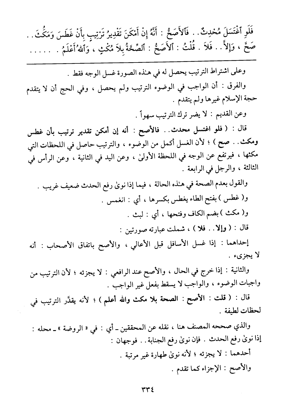 فَلَوِ اَغْتَسَلَ مُحْدِثٌ .. فَالأَصَحُّ: أَنَّهُ إِنْ أَمْكَنَ تَقْدِيرُ تَرْتَيبِ بِأَنْ غَطَسَ وَمَكَثَ .. صَحَّ، وَإِلاَّ .. فَلاَ. قُلْتُ: الأَصَحُّ: الصَّحَّةُ بَلاَ مُكْثٍ، وَاللهُ أَعْلَمُ