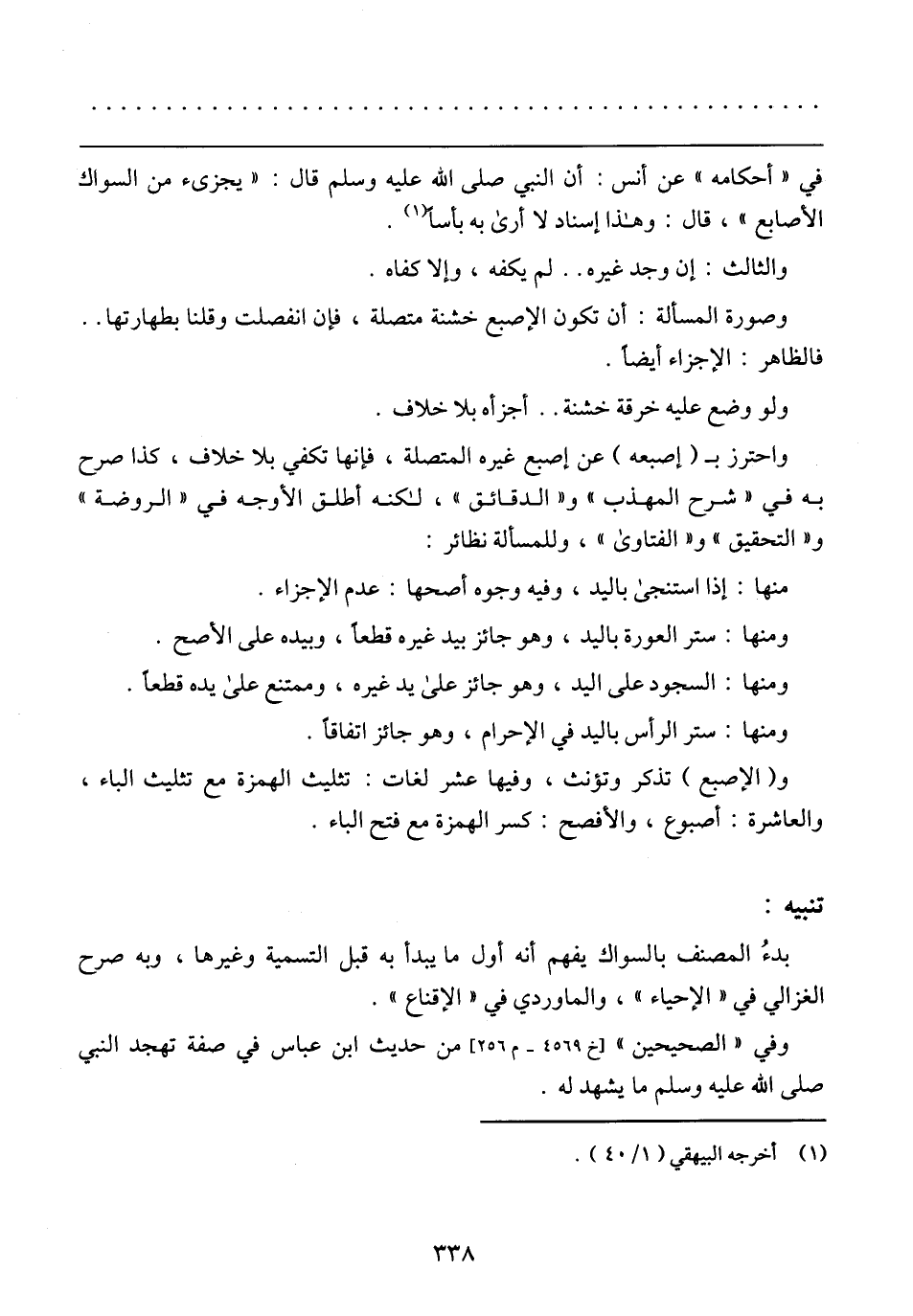 واحترز بـ (إصبعه) عن إصبع غيره المتصلة، فإنها تكفي بلا خلاف، كذا صرح به في (شرح المهذب) و (الدقائق)، لكنه أطلق الأوجه في (الروضة) و (التحقيق) و (الفتاوى)، وللمسألة نظائر: