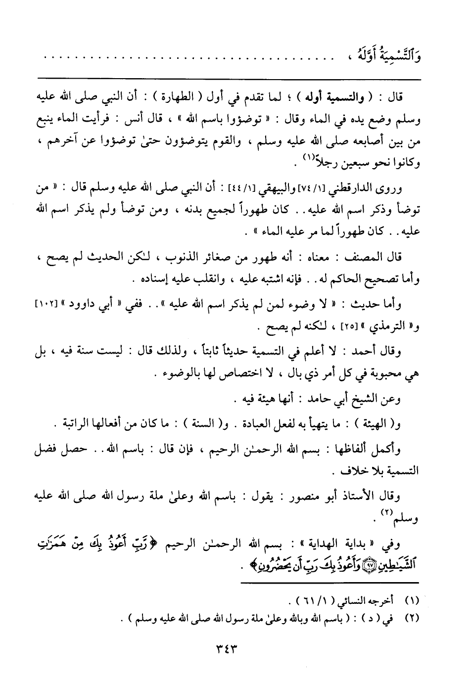 وروى الدارقطني [1/ 74] والبيهقي [1/ 44]: أن النبي صلى الله عليه وسلم قال: (من توضأ وذكر اسم الله عليه .. كان طهوراً لجميع بدنه، ومن توضأ ولم يذكر اسم الله عليه .. كان طهوراً لما مر عليه الماء).