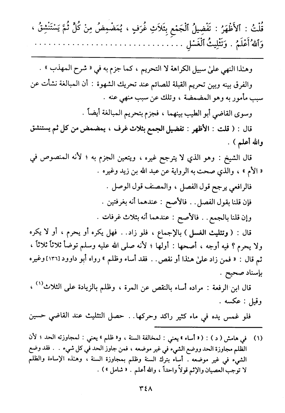 قُلْتُ: اَلأَظْهَرُ: تَفْضِيلُ اَلْجَمْعِ بِثَلاَثِ غُرَفٍ، يُمَضْمِضُ مِنْ كُلًّ ثُمَّ يَسْتَنْشِقُ، وَاللهُ أَعْلَمُ. وَتَثْلِيثُ اَلْغَسْلِ