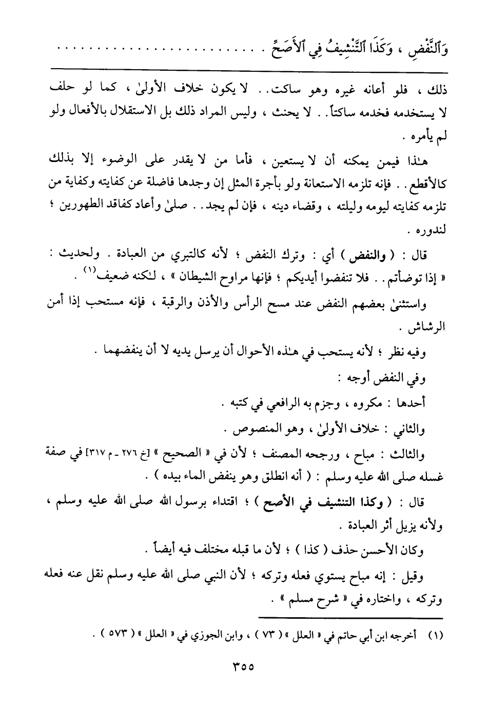 قال: (والنفض) أي: وترك النفض؛ لأنه كالتبري من العبادة. ولحديث: (إذا توضأتم .. فلا تنفضوا أيديكم؛ فإنه مراوح الشيطان)، لكنه ضعيف.