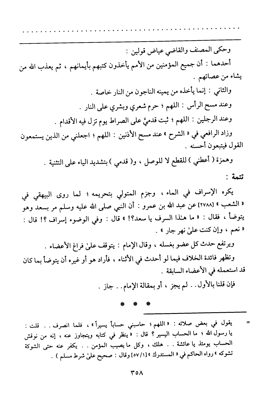 يكره الإسراف في الماء، وجزم المتولي بتحريمه؛ لما روى البيهقي في (الشعب) [2788] عن عبد الله بن عمرو: أن النبي صلى الله عليه وسلم مر بسعد وهو يتوضأ، فقال: (ما هذا السرف يا سعد؟!) قال: وفي الوضوء إسراف؟! قال: (نعم، وإن كنت على نهر جار).