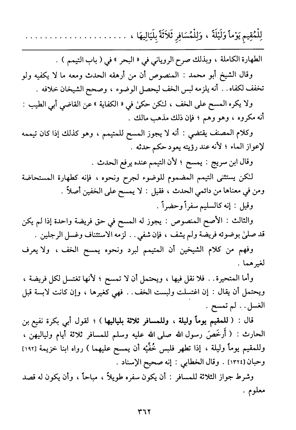 قال: (للمقيم يوما وليلة، وللمسافر ثلاثة بلياليها)؛ لقول أبي بكرة نفيع بن الحارث: (أرخص رسول الله صلى الله عليه وسلم للمسافر ثلاثة أيام ولياليهن، وللمقيم يوما وليلة، إذا تطهر فلبس خفيه أن يمسح عليهما) رواه ابنا خزيمة [192] وحبان [1324]. وقال الخطابي: إنه صحيح الإسناد.