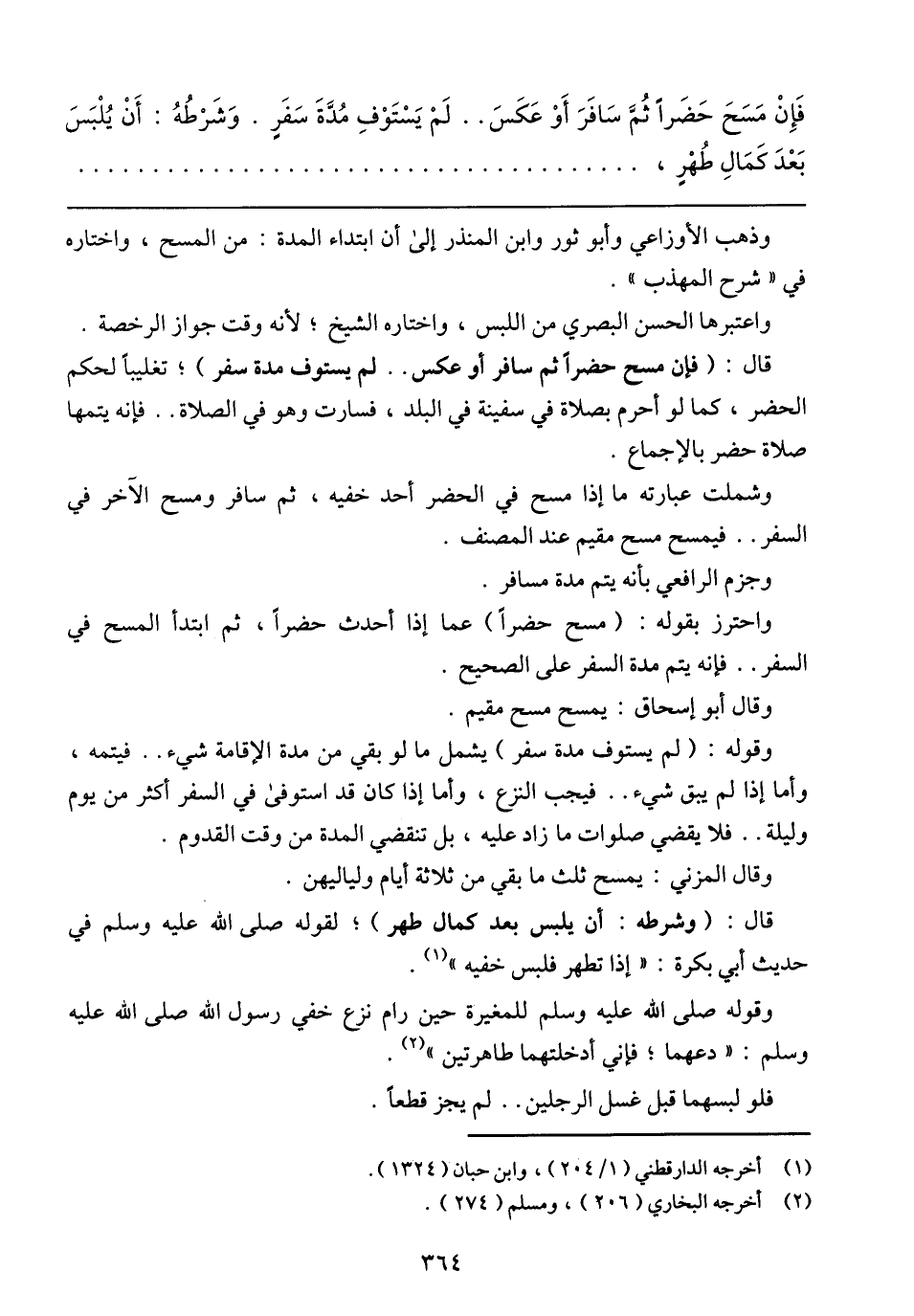 فَإِنْ مَسَحَ حَضَراً ثُمَّ سَافَرَ أَوْ عَكَسَ .. لَمْ يَسْتَوْفِ مُدَّةَ سَفَرٍ. وَشَرْطُهُ: أَنْ يُلْبَسَ بَعْدَ كَمَالِ طُهْرٍ،
