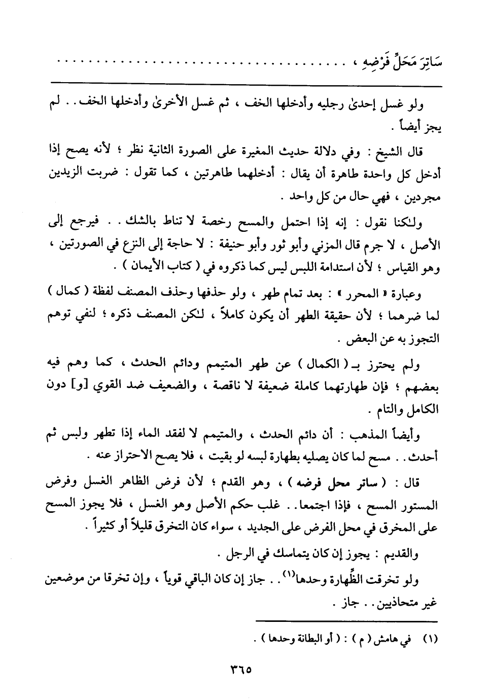 قال: (ساتر محل فرضه)، وهو القدم؛ لأن فرض الظاهر الغسل وفرض المستور المسح، فإذا اجتمعا .. غلب حكم الأصل وهو الغسل، فلا يجوز المسح على المخرق في محل الفرض على الجديد، سواء كان التخرق قليلا أو كثيرا.