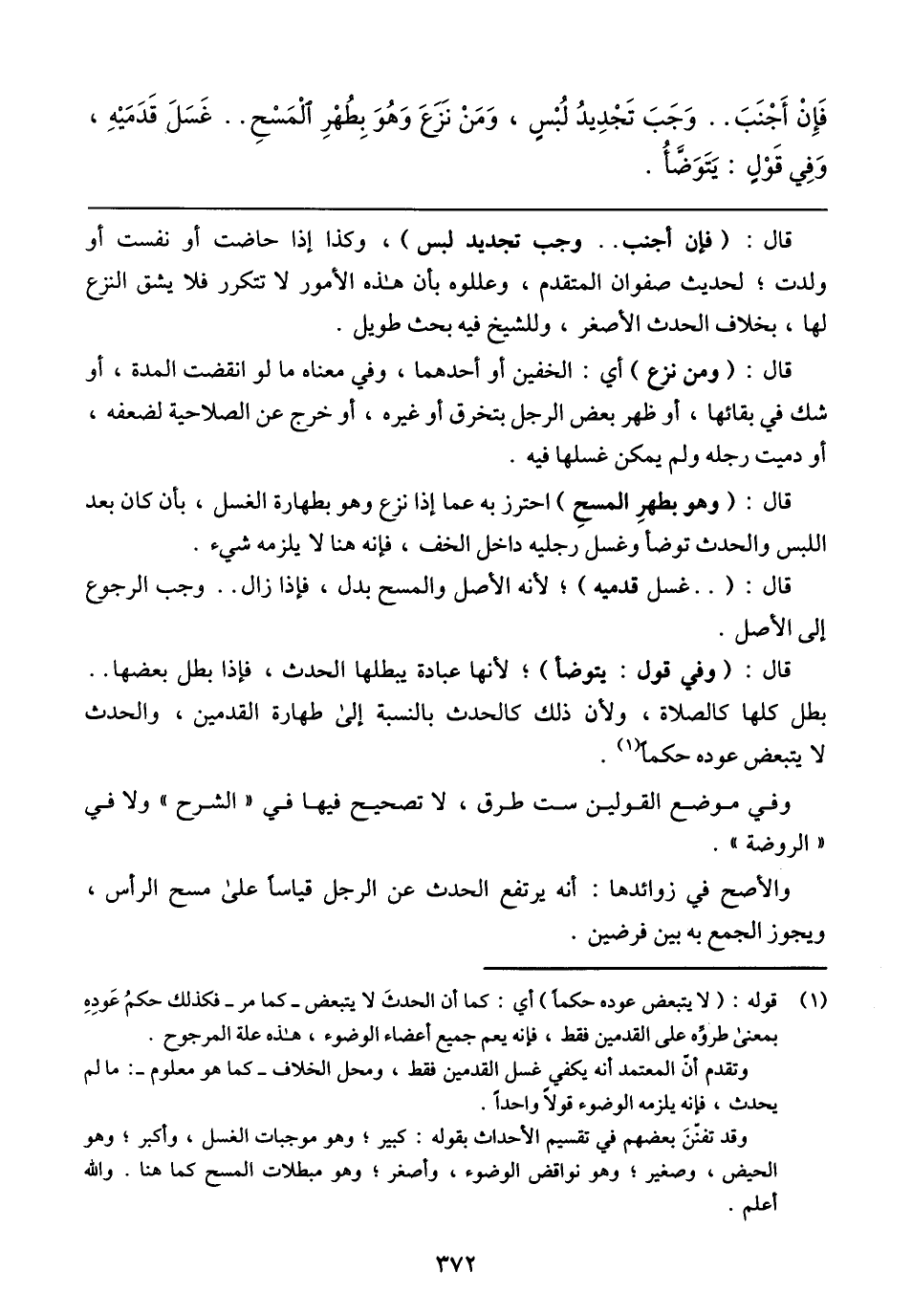 قال: (وفي قول: يتوضأ)؛ لأنها عبادة يبطلها الحدث، فإذا بطل بعضها .. بطل كلها كالصلاة، ولأن ذلك كالحدث بالنسبة إلى طهارة القدمين، والحدث لا يتبعض عوده حكما.