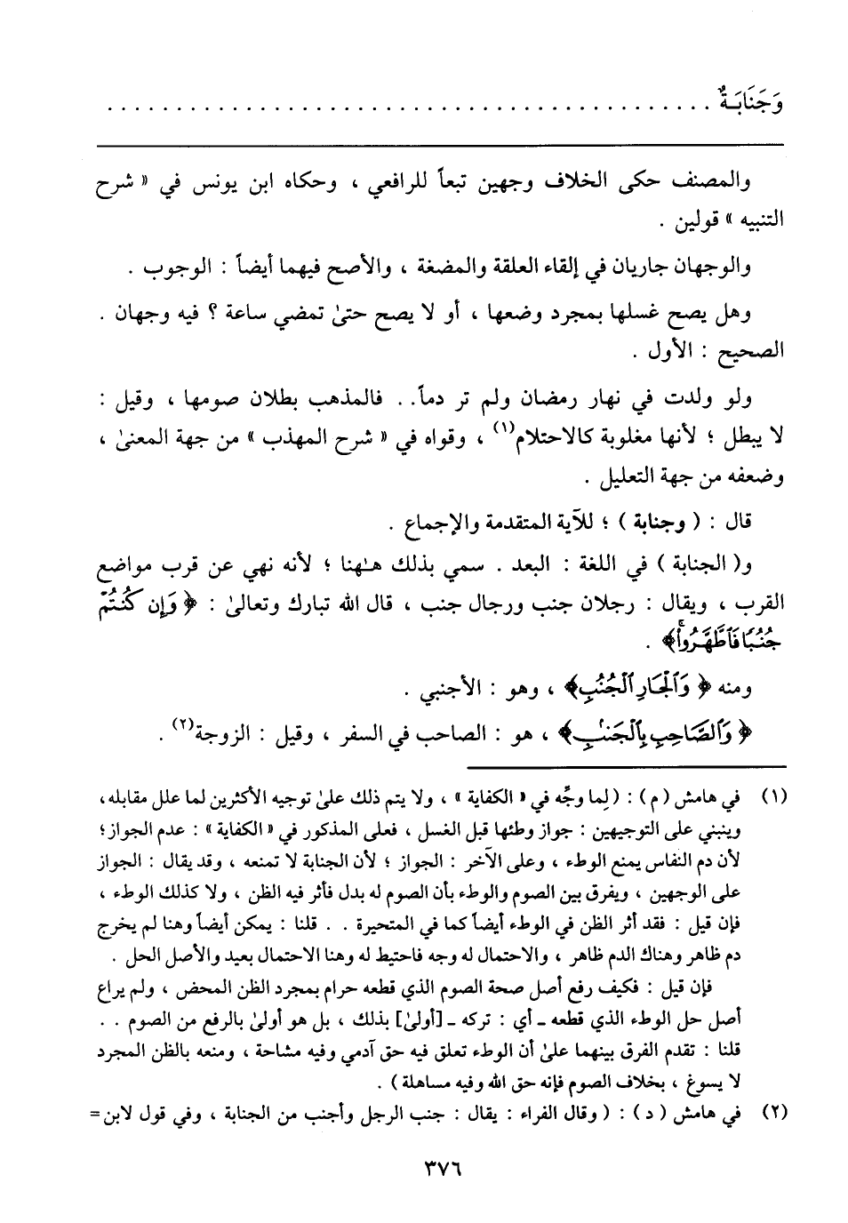 و (الجنابة) في اللغة: البعد. سمي بذلك ههنا؛ لأنه نهي عن قرب مواضع القرب، ويقال: رجلان جنب ورجال جنب، قال الله تبارك وتعالى: {وإن كُنتُمْ جُنُبًا فَاطَّهَّرُوا}.