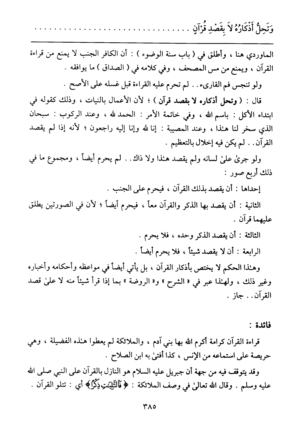 وهذا الحكم لا يختص بأذكار القرآن، بل يأتي أيضا في مواعظه وأحكامه وأخباره وغير ذلك، ولهذا عبر في (الشرح) و (الروضة) بما إذا قرأ شيئا منه لا على قصد القرآن .. جاز.