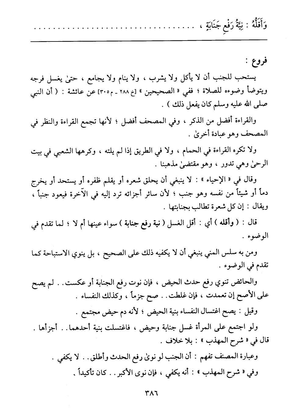 وقال في (الإحياء): لا ينبغي أن يحلق شعره أو يقلم ظفره أو يستحد أو يخرج دما أو شيئا من نفسه وهو جنب؛ لأن سائر أجزائه ترد إليه في الآخرة فيعود جنبا، ويقال: إن كل شعرة تطالب بجنابتها.