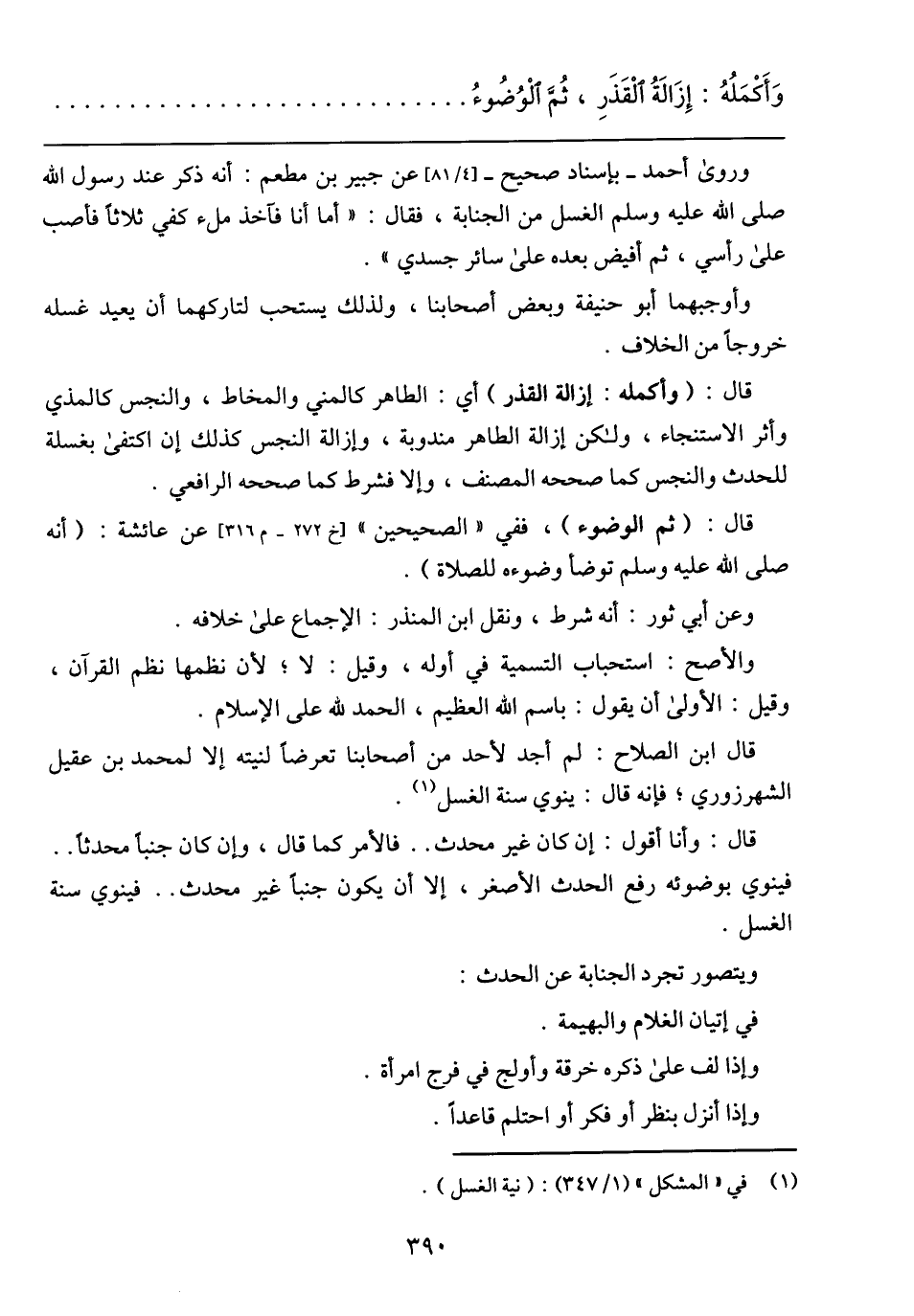 وَأَكْمَلُهُ: إِزَالَةُ الْقَذَرِ، ثُمَّ الْوُضُوءُ.