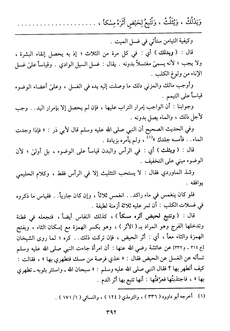 قال: (وتتبع لحيض أثره مسكا)، كذلك النفاس أيضا، فتجعله في قطنة وتدخلها الفرج وهو المراد بـ (الأثر)، وهو بكسر الهمزة مع إسكان الثاء، وبفتح الهمزة والثاء معا، أي: أثر الحيض، فإن تركت ذلك .. كره؛ لما روى الشيخان [خ 314 – م 332] عن عائشة رضي الله عنها: أن امرأة جاءت النبي صلى الله عليه وسلم تسأله عن الغسل عن الحيض فقال: (خذي فرصة من مسك فتطهري بها)، فقالت: كيف أتطهر بها؟ فقال النبي صلى الله عليه وسلم: (سبحان الله – واستتر بثوبه – تطهري بها)، فاجتذبتها فعرفتها: أنها تتبع بها أثر الدم.