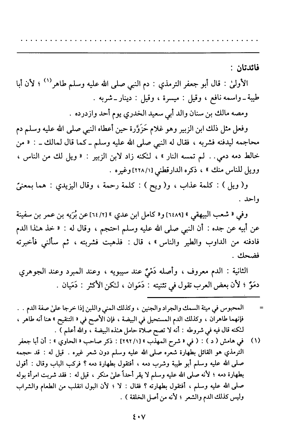 الأولى: قال أبو جعفر الترمذي: دم النبي صلى الله عليه وسلم طاهر؛ لأن أبا طيبة – واسمه نافع، وقيل: ميسرة، وقيل: دينار – شربه.