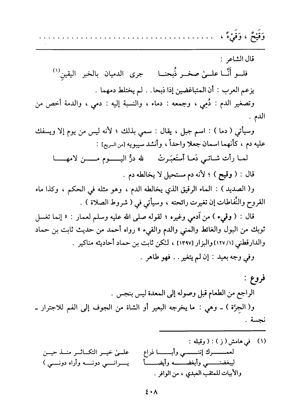 قال: (وقيء) من آدمي وغيره؛ لقوله صلى الله عليه وسلم لعمار: (إنما تغسل ثوبك من البول والغائط والمني والدم والقيء) رواه أحمد من حديث ثابت بن حماد والدارقطني [1/ 127] والبزار [1397]، لكن ثابت بن حماد أحاديثه مناكير.