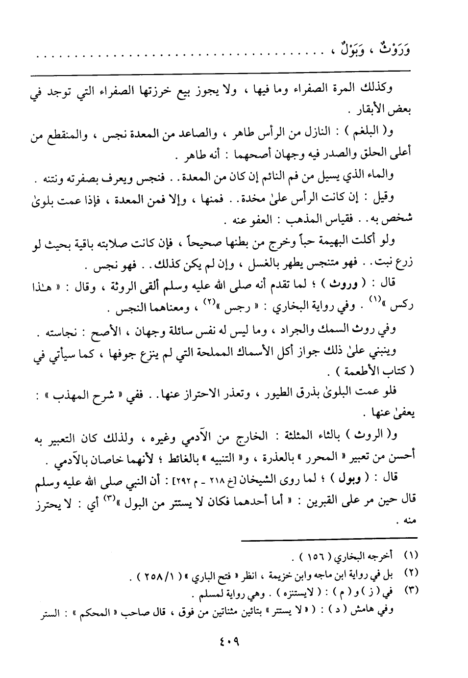 و (البلغم): النازل من الرأس طاهر، والصاعد من المعدة نجس، والمنقطع من أعلى الحلق والصدر فيه وجهان أصحهما: أنه طاهر.