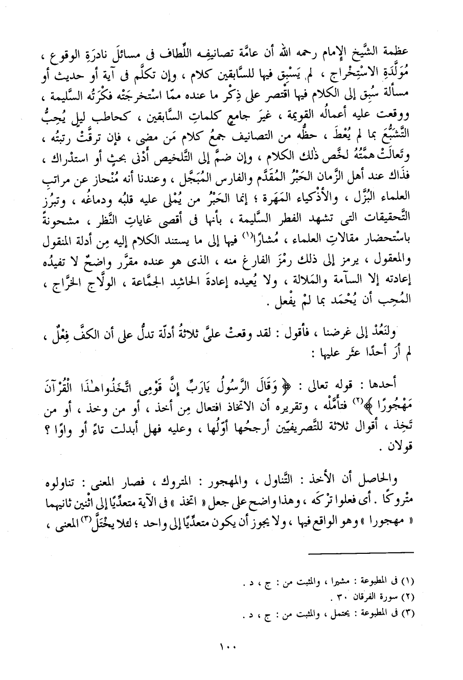 وَالْحَاصِل أَن الْأَخْذ التَّنَاوُل والمهجور الْمَتْرُوك فَصَارَ الْمَعْنى تناولوه متروكا أَي فعلوا تَركه وَهَذَا وَاضح عَلَى جعل اتخذ فِي الْآيَة مُتَعَدِّيا إِلَى اثْنَيْنِ ثَانِيهمَا مَهْجُورًا وَهُوَ الْوَاقِع فِيهَا وَلَا يجوز أَن يكون مُتَعَدِّيا إِلَى وَاحِد لِئَلَّا يخْتل الْمَعْنى
