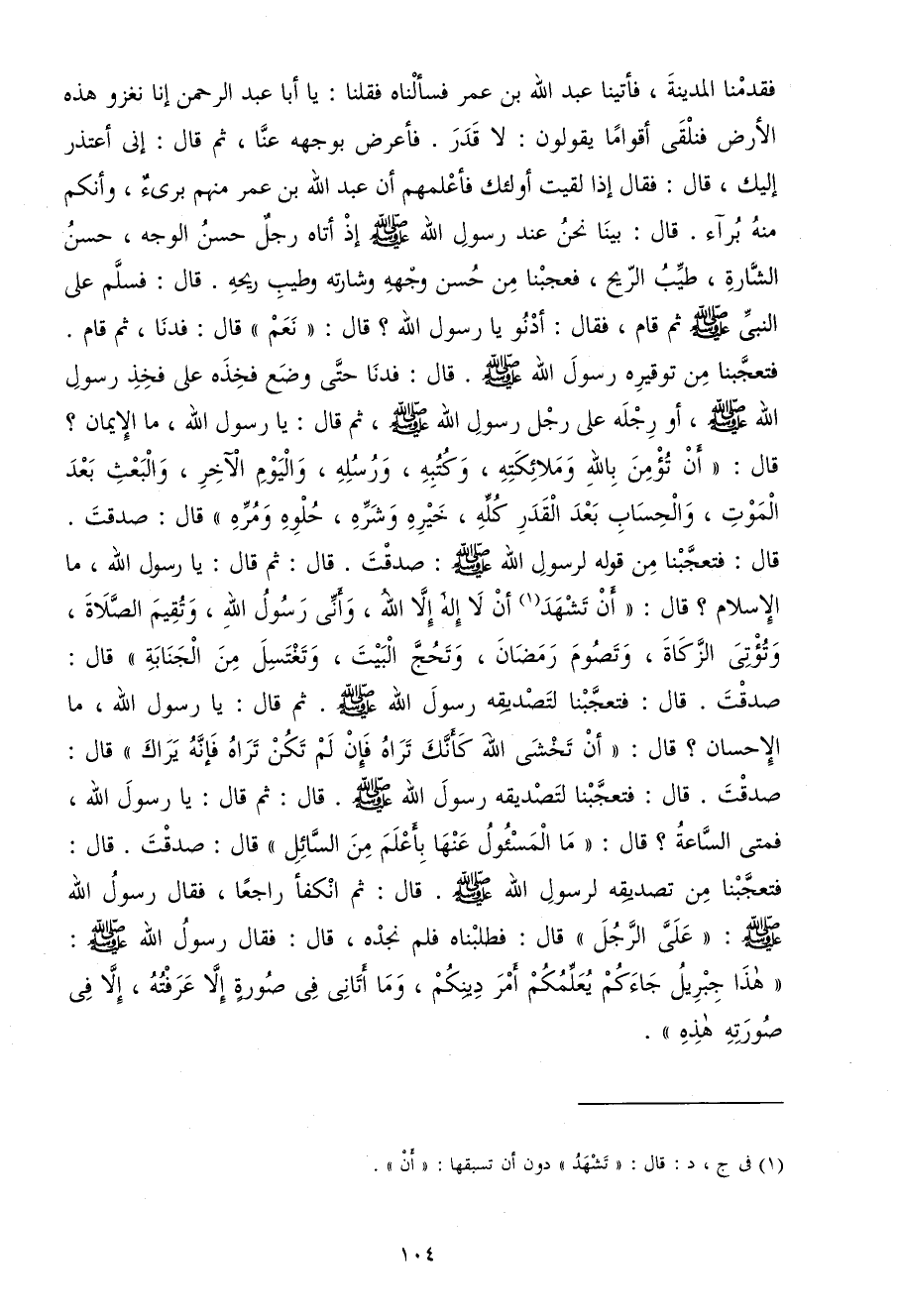 فَقَدِمْنَا الْمَدِينَةَ فَأَتَيْنَا عَبْدَ اللَّهِ بْنَ عُمَرَ فَسَأَلْنَاهُ فَقُلْنَا يَا أَبَا عَبْدِ الرَّحْمَنِ إِنَّا نَغْزُو هَذِهِ الأَرْضَ فَنَلْقَى أَقْوَامًا يَقُولُونَ لَا قَدَرَ فَأَعْرَضَ بِوَجْهِهِ عَنَّا ثُمَّ قَالَ إِنِّي أَعْتَذِرُ إِلَيْكَ قَالَ فَقَالَ إِذَا لَقِيتَ أُولَئِكَ فَأَعْلِمْهُمْ أَنَّ عَبْدَ اللَّهِ بْنَ عُمَرَ مِنْهُمْ بَرِيءٌ وَأَنَّكُمْ مِنْهُ بُرَآءُ قَالَ بَيْنَا نَحْنُ عِنْد رَسُول الله صلى الله عَلَيْهِ وَسلم إِذْ أَتَاهُ رَجُلٌ حَسَنُ الْوَجْهِ حَسَنُ الشَّارَةِ طَيِّبُ الرِّيحِ فَعَجِبْنَا مِنْ حُسْنِ وَجْهِهِ وَشَارَتِهِ وَطِيبِ رِيحِهِ قَالَ فَسَلَّمَ عَلَى النَّبِيِّ صَلَّى اللَّهُ عَلَيْهِ وَسَلَّمَ ثُمَّ قَامَ فَقَالَ أَدْنُو يَا رَسُولَ اللَّهِ قَالَ نَعَمْ قَالَ فَدَنَا ثُمَّ قَامَ فَتَعَجَّبْنَا مِنْ تَوْقِيرِهِ رَسُولِ اللَّهِ صَلَّى اللَّهُ عَلَيْهِ وَسَلَّمَ قَالَ فَدَنَا حَتَّى وَضَعَ فَخِذَهُ عَلَى فَخِذِ رَسُولِ اللَّهِ صَلَّى اللَّهُ عَلَيْهِ وَسَلَّمَ أَوْ رِجْلَهُ عَلَى رِجْلِ رَسُول الله صلى الله عَلَيْهِ وَسلم ثمَّ قَالَ يَا رَسُولَ اللَّهِ مَا الإِيمَانُ قَالَ أَن تؤمن بِاللَّه وَمَلَائِكَته وَكتبه وَرُسُله وَالْيَوْم الآخر والبعث بعد الْمَوْت والحساب بعد الْقدر كُلِّهِ خَيْرِهِ وَشَرِّهِ حُلْوِهِ وَمُرِّهِ قَالَ صَدَقْتَ قَالَ فَتَعَجَّبْنَا مِنْ قَوْلِهِ لِرَسُولِ اللَّهِ صَلَّى اللَّهُ عَلَيْهِ وَسَلَّمَ صَدَقْتَ قَالَ ثُمَّ قَالَ يَا رَسُولَ اللَّهِ مَا الإِسْلامُ قَالَ أَنْ تَشْهَدَ أَنْ لَا إِلَهَ إِلا اللَّهُ وَأَنِّي رَسُول الله وتقيم الصَّلَاة وتؤتي الزَّكَاة وتصوم رَمَضَانَ وَتَحُجَّ الْبَيْتَ وَتَغْتَسِلَ مِنَ الْجَنَابَةِ قَالَ صَدَقْتَ قَالَ فَتَعَجَّبْنَا لِتَصْدِيقِهِ رَسُولِ اللَّهِ صَلَّى اللَّهُ عَلَيْهِ وَسَلَّمَ ثُمَّ قَالَ يَا رَسُولَ اللَّهِ مَا الإِحْسَانُ قَالَ أَنْ تَخْشَى اللَّهَ كَأَنَّك ترَاهُ فَإِن لم تكن ترَاهُ فَإِنَّهُ يَرَاكَ قَالَ صَدَقْتَ قَالَ فَتَعَجَّبْنَا لِتَصْدِيقِهِ رَسُولِ الله صلى الله عَلَيْهِ وَسلم قَالَ ثمَّ قَالَ يَا رَسُولَ اللَّهِ فَمَتَى السَّاعَةُ قَالَ مَا الْمَسْئُول عَنْهَا بِأَعْلَم من السَّائِل قَالَ صَدَقْتَ قَالَ فَتَعَجَّبْنَا مِنْ تَصْدِيقِهِ لِرَسُولِ اللَّهِ صَلَّى اللَّهُ عَلَيْهِ وَسَلَّمَ قَالَ ثُمَّ انْكَفَأَ رَاجِعًا فَقَالَ رَسُولُ اللَّهِ صَلَّى اللَّهُ عَلَيْهِ وَسلم على الرجل قَالَ فَطَلَبْنَاهُ فَلَمْ نَجِدْهُ قَالَ فَقَالَ رَسُولُ الله صلى الله عَلَيْهِ وَسلم هَذَا جِبْرِيل جَاءَكُمْ يُعَلِّمُكُمْ أَمْرَ دِينِكُمْ وَمَا أَتَانِي فِي صُورَةٍ إِلا عَرَفْتُهُ إِلا فِي صُورَتِهِ هَذِهِ