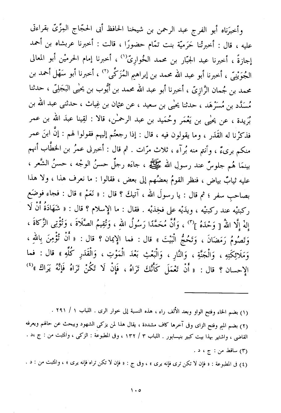 وأخبرناه أَبُو الْفرج عبد الرَّحْمَن بن شَيْخِنَا الْحَافِظِ أَبِي الْحَجَّاجِ الْمِزِّيِّ بِقِرَاءَتِي عَلَيْهِ قَالَ أَخْبَرَتْنَا حَرَمِيَّةُ بِنْتُ تَمَّامٍ حُضُورًا قَالَتْ أخبرنَا عربشاه بن أَحْمد إجَازَة أخبرنَا عبد الْجَبَّارِ بْنُ مُحَمَّدٍ الْخُوَارِيُّ أَخْبَرَنَا إِمَامُ الْحَرَمَيْنِ أَبُو الْمَعَالِي الْجُوَيْنِيُّ أَخْبَرَنَا أَبُو عَبْدِ اللَّهِ مُحَمَّدُ بْنُ إِبْرَاهِيمَ الْمُزَكِّي أَخْبَرَنَا أَبُو سَهْلٍ أَحْمَدُ بْنُ مُحَمَّدِ بْنِ جَمَّانَ الرَّازِيُّ أَخْبَرَنَا أَبُو عَبْدِ اللَّهِ مُحَمَّدُ بْنُ أَيُّوبَ بْنِ يَحْيَى الْبَجَلِيُّ حَدَّثَنَا مُسَدَّدُ بْنُ مُسَرْهَدٍ حَدَّثَنَا يحيى بن سعيد عَن عُثْمَان بن غياث حَدَّثَنِي عَبْدُ اللَّهِ بْنُ بُرَيْدَةَ عَنْ يَحْيَى بْنِ يَعْمُرَ وَحُمَيْدِ بْنِ عَبْدِ الرَّحْمَنِ قَالا لَقِينَا عَبْدَ اللَّهِ بْنَ عُمَرَ فَذَكَرْنَا لَهُ الْقَدَرَ وَمَا يَقُولُونَ فِيهِ قَالَ إِذَا رَجَعْتُمْ إِلَيْهِمْ فَقُولُوا لَهُمْ إِنَّ ابْنَ عُمَرَ مِنْكُمْ بَرِيءٌ وَأَنْتُمْ مِنْهُ بُرَآءُ ثَلاثَ مَرَّاتٍ ثُمَّ قَالَ أَخْبَرَنِي عُمَرُ بْنُ الْخَطَّابِ أَنَّهُمْ بَيْنَمَا هُمْ جُلُوسٌ عِنْدَ رَسُولِ اللَّهِ صَلَّى اللَّهُ عَلَيْهِ وَسَلَّمَ جَاءَهُ رَجُلٌ حَسَنُ الْوَجْهِ حَسَنُ الشَّعْرِ عَلَيْهِ ثِيَابُ بَيَاضٍ فَنَظَرَ الْقَوْمُ بَعْضُهُمْ إِلَى بَعْضٍ فَقَالُوا مَا نَعْرِفُ هَذَا وَلا هَذَا بِصَاحِبِ سَفَرٍ ثُمَّ قَالَ يَا رَسُولَ اللَّهِ آتِيكَ قَالَ نَعَمْ قَالَ فَجَاءَ فَوَضَعَ رُكْبَتَيْهِ عِنْدَ رُكْبَتَيْهِ وَيَدَيْهِ عَلَى فَخِذَيْهِ فَقَالَ مَا الإِسْلامُ قَالَ شَهَادَةُ أَنْ لَا إِلَهَ إِلا اللَّهُ وَحْدَهُ وَأَنَّ مُحَمَّدًا رَسُولُ اللَّهِ وتقيم الصَّلَاة وتؤتي الزَّكَاة وتصوم رَمَضَان وتحج الْبَيْتَ قَالَ فَمَا الإِيمَانُ قَالَ أَنْ تُؤْمِنَ بِاللَّهِ وَمَلائِكَتِهِ وَالْجَنَّةِ وَالنَّارِ وَالْبَعْثِ بَعْدَ الْمَوْتِ وَالْقَدَرِ كُلِّهِ قَالَ فَمَا الإِحْسَانُ قَالَ أَنْ تَعْمَلَ كَأَنَّكَ تَرَاهُ فَإِنْ لَا تَكُنْ تَرَاهُ فَإِنَّهُ يراك