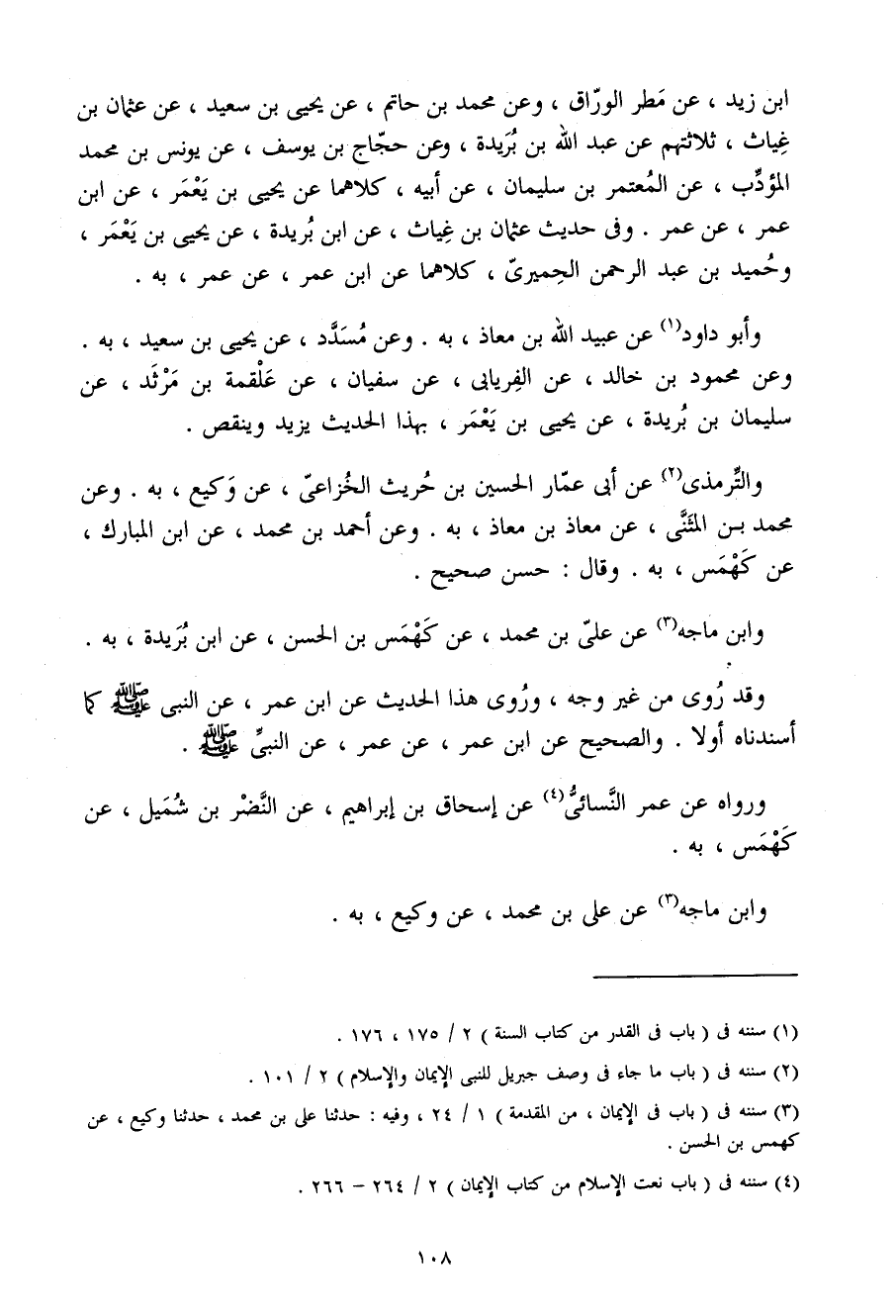 ابْن زَيْدٍ عَنْ مَطَرٍ الْوَرَّاقِ وَعَنْ مُحَمَّدِ بْنِ حَاتِمٍ عَنْ يَحْيَى بْنِ سَعِيدٍ عَنْ عُثْمَانَ بْنِ غِيَاثٍ ثَلاثَتُهُمْ عَنْ عَبْدِ اللَّهِ بْنِ بُرَيْدَةَ وَعَنْ حَجَّاجِ بْنِ يُوسُفَ عَنْ يُونُسَ بْنِ مُحَمَّدٍ الْمُؤَدِّبِ عَنِ الْمُعْتَمِرِ بْنِ سُلَيْمَانَ عَنْ أَبِيهِ كِلاهُمَا عَنْ يَحْيَى بْنِ يَعْمُرَ عَنِ ابْنِ عُمَرَ عَنْ عُمَرَ وَفِي حَدِيثِ عُثْمَانَ بْنِ غِيَاثٍ عَنِ ابْنِ بُرَيْدَةَ عَنْ يَحْيَى بْنِ يَعْمُرَ وَحُمَيْدِ بْنِ عَبْدِ الرَّحْمَنِ الْحِمْيَرِيِّ كِلاهُمَا عَنِ ابْنِ عُمَرَ عَنْ عُمَرَ بِهِ