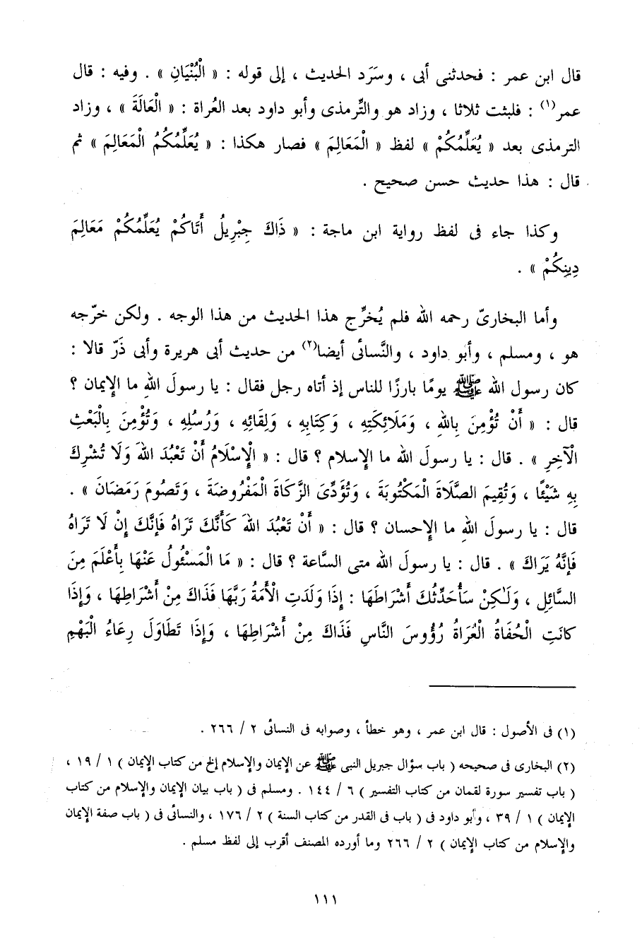 قَالَ ابْن عمر فحَدَّثَنِي أَبِي وسرد الحَدِيث إِلَى قَوْله الْبُنيان وَفِيه قَالَ عمر فَلَبثت ثَلَاثًا وَزَاد هُوَ وَالتِّرْمِذِيّ وَأَبُو دَاوُد بعد العراة العالة وَزَاد التِّرْمِذِيّ بعد تعلمكم لفظ المعالم فَصَارَ هَكَذَا يعلمكم المعالم ثمَّ قَالَ هَذَا حَدِيث حسن صَحِيح