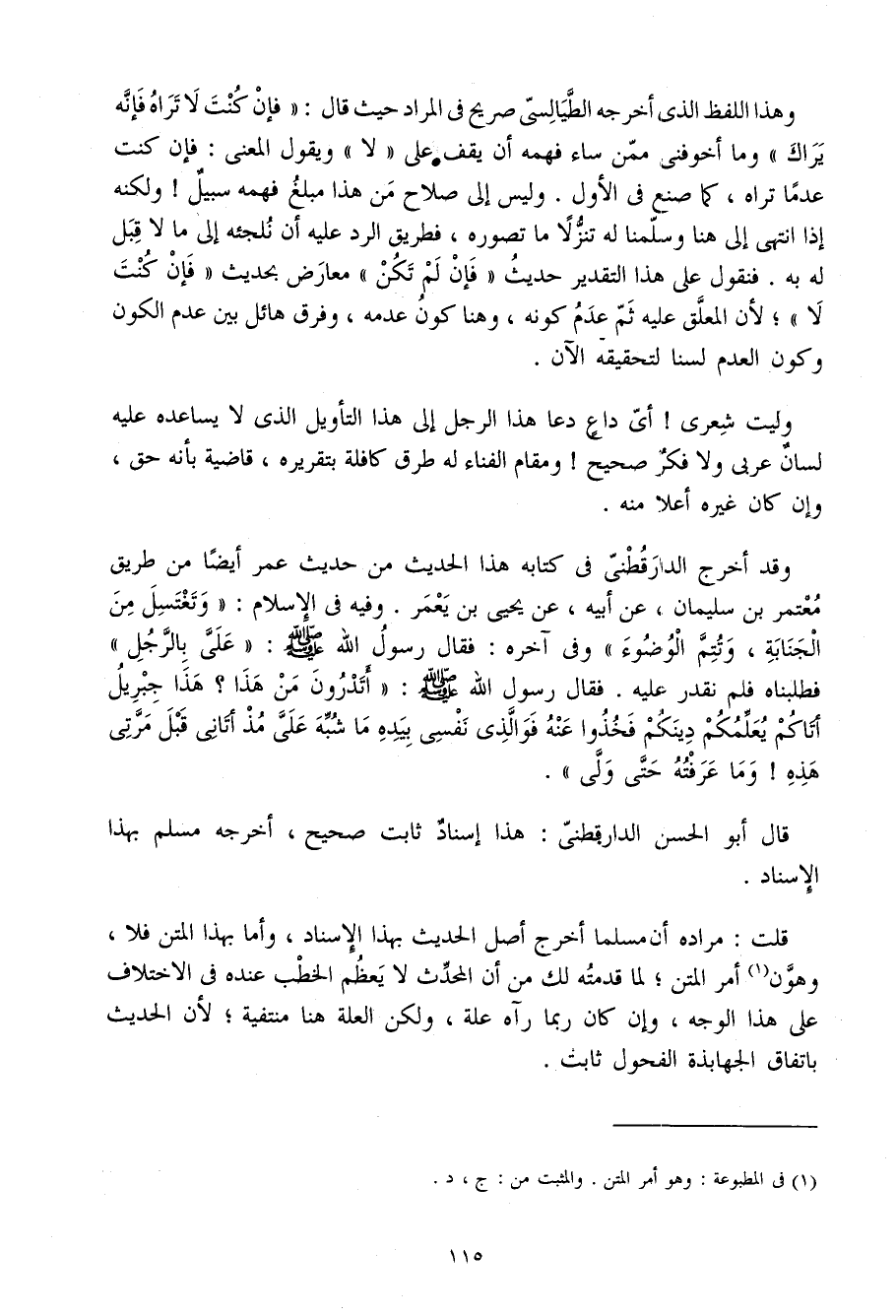 وَقد أخرج الدَّارَقُطْنِيّ فِي كِتَابه هَذَا الحَدِيث من حَدِيث عمر أَيْضًا من طَرِيق مُعْتَمر بْن سُلَيْمَان عَن أَبِيه عَن يَحْيَى بْن يعمر وَفِيه فِي الْإِسْلَام وتغتسل من الْجَنَابَة وتتم الْوضُوء وَفِي آخِره فَقَالَ رَسُول الله صلى الله عَلَيْهِ وَسلم عَليّ بِالرجلِ فطلبناه فَلم نقدر عَلَيْهِ فَقَالَ رَسُول اللَّهِ صَلَّى اللَّهُ عَلَيْهِ وَسَلَّمَ أَتَدْرُونَ من هَذَا هَذَا جِبْرِيل أَتَاكُم يعلمكم دينكُمْ فَخُذُوا عَنهُ فوالذي نَفسِي بِيَدِهِ مَا شبه عَلِيّ مذ أَتَانِي قبل مرتي هَذِهِ وَمَا عَرفته حَتَّى ولى