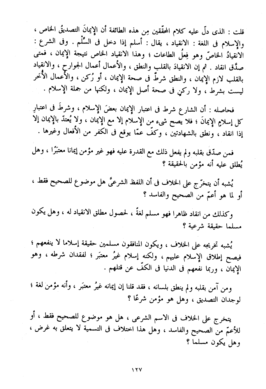 قلت الَّذِي دلّ عَلَيْهِ كَلَام الْمُحَقِّقين من هَذِهِ الطَّائِفَة أَن الْإِيمَان التَّصْدِيق الْخَاص وَالْإِسْلَام فِي اللُّغَة الانقياد يُقَال أسلم إِذا دخل فِي السّلم وَفِي الشَّرْع الانقياد الْخَاص وَهُوَ فعل الطَّاعَات وَهَذَا الانقياد الْخَاص نتيجة الْإِيمَان فَمَتَى صدق انْقَادَ ثمَّ إِن الانقياد بِالْقَلْبِ والنطق والأعمال أَعمال الْجَوَارِح والانقياد بِالْقَلْبِ لَازم الْإِيمَان والنطق شَرط فِي صِحَة الْإِيمَان أَو ركن والأعمال الْأُخَر لَيست بِشَرْط وَلَا ركن فِي صِحَة أصل الْإِيمَان وَلكنهَا من جملَة الْإِسْلَام