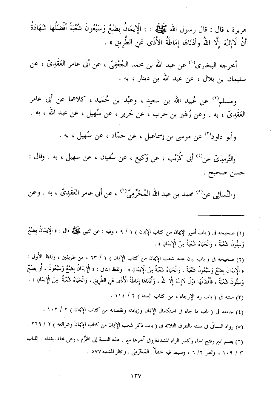 هُرَيْرَةَ قَالَ قَالَ رَسُولُ اللَّهِ صَلَّى اللَّهُ عَلَيْهِ وَسَلَّمَ الإِيمَانُ بِضْعٌ وَسَبْعُونَ شُعْبَةً أَفْضَلُهَا شَهَادَةُ أَنْ لَا إِلَهَ إِلا اللَّهُ وَأَدْنَاهَا إِمَاطَةُ الأَذَى عَنِ الطَّرِيقِ