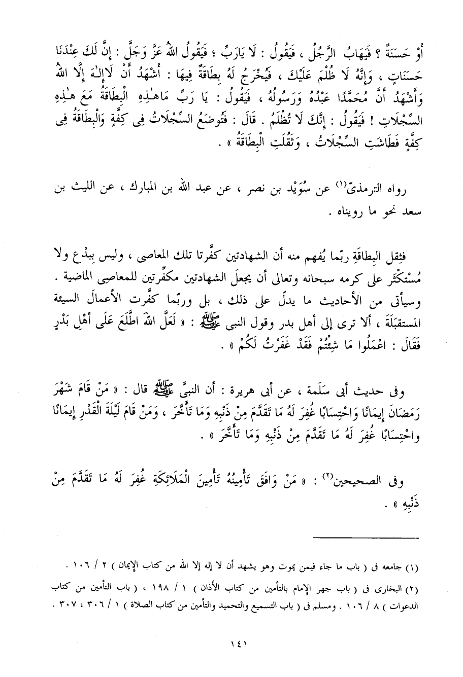 فثقل البطاقة رُبمَا يفهم مِنْهُ أَن الشَّهَادَتَيْنِ كَفَرَتا تِلْكَ الْمعاصِي وَلَيْسَ ببدع وَلَا مستكثر عَلَى كرمه سُبْحَانَهُ وَتَعَالَى أَن يَجْعَل الشَّهَادَتَيْنِ مُكَفِرَتَيْنِ للمعاصي الْمَاضِيَة وَسَيَأْتِي من الْأَحَادِيث مَا يدل عَلَى ذَلِك بل وَرُبمَا كفرت الْأَعْمَال السَّيئَة الْمُسْتَقْبلَة أَلا ترى إِلَى أهل بدر وَقَول النَّبِي صَلَّى اللَّهُ عَلَيْهِ وَسَلَّمَ لَعَلَّ اللَّه اطلع عَلَى أهل بدر فَقَالَ اعْمَلُوا مَا شِئْتُم فقد غفرت لكم