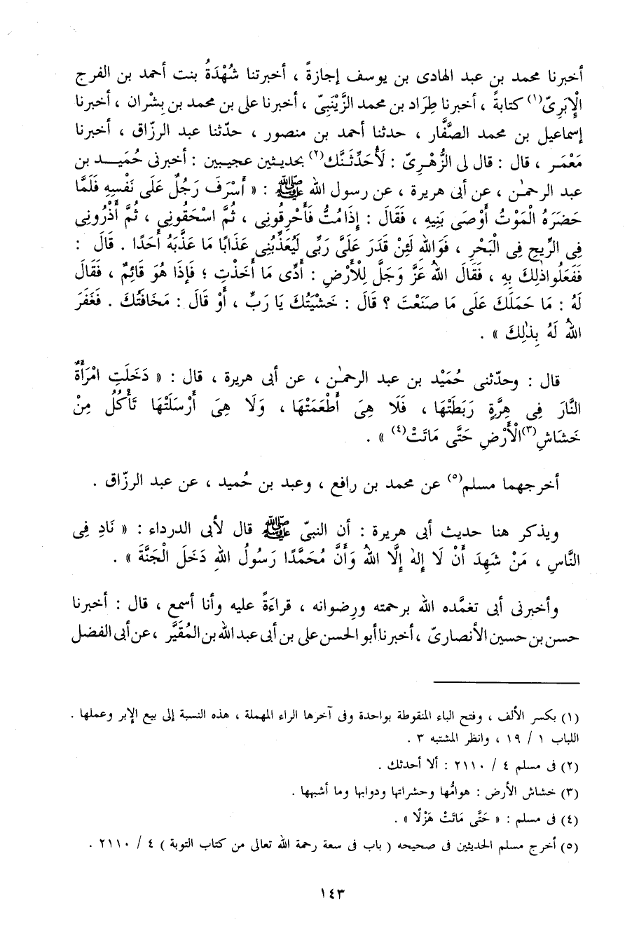 أَخْبَرَنَا مُحَمَّدُ بْنُ عَبْدِ الْهَادِي بْنِ يُوسُفَ إِجَازَةً أَخْبَرَتْنَا شُهْدَةُ بِنْتُ أَحْمَدَ بْنِ الْفَرَجِ الإِبَرِيُّ كِتَابَةً أَخْبَرَنَا طِرَادُ بْنُ مُحَمَّدٍ الزَّيْنَبِيُّ أَخْبَرَنَا عَلِيُّ بْنُ مُحَمَّدِ بْنِ بِشْرَانَ أَخْبَرَنَا إِسْمَاعِيلُ بْنُ مُحَمَّدٍ الصَّفَّارُ حَدَّثَنَا أَحْمَدُ بْنُ مَنْصُورٍ حَدَّثَنَا عَبْدُ الرَّزَّاقِ أَخْبَرَنَا مَعْمَرٌ قَالَ قَالَ لِي الزُّهْرِيُّ لأُحَدِّثَنَّكَ بِحَدِيثَيْنِ عَجِيبَيْنِ أَخْبَرَنِي حُمَيْدُ بْنُ عَبْدِ الرَّحْمَنِ عَنْ أَبِي هُرَيْرَةَ عَن رَسُول الله صلى الله عَلَيْهِ وَسلم أَسْرَفَ رَجُلٌ عَلَى نَفْسِهِ فَلَمَّا حَضَرَهُ الْمَوْتُ أَوْصَى بَنِيهِ فَقَالَ إِذَا مِتُّ فَأَحْرِقُونِي ثُمَّ استحقوني ثمَّ أذروني فِي الرّيح فِي الْبَحْر فوَاللَّه لَئِنْ قَدَرَ عَلَيَّ رَبِّي لَيُعَذِّبَنِّي عَذَابًا مَا عَذَّبَهُ أَحَدًا قَالَ فَفَعَلُوا ذَلِكَ بِهِ فَقَالَ اللَّهُ عَزَّ وَجَلَّ لِلأَرْضِ أَدِّي مَا أَخَذْتِ فَإِذَا هُوَ قَائِمٌ فَقَالَ لَهُ مَا حَمَلَكَ عَلَى مَا صَنَعْتَ قَالَ خَشْيَتُكَ يَا رَبِّ أَوْ قَالَ مَخَافَتُكَ فَغَفَرَ اللَّهُ لَهُ بِذَلِكَ