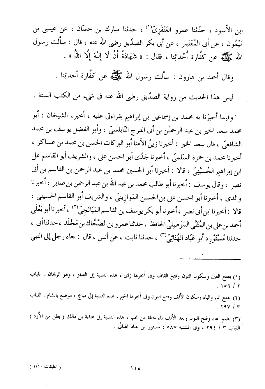 ابْن الأَسْوَدِ حَدَّثَنَا عَمْرٌو الْعَنْقَزِيُّ حَدَّثَنَا مُبَارَكُ بْنُ حَسَّانٍ عَنْ عِيسَى بْنِ مَيْمُونٍ عَنْ أَبِي الْمُعْتَمِرِ عَنْ أَبِي بَكْرٍ الصِّدِّيقِ رَضِيَ اللَّهُ عَنْهُ قَالَ سَأَلْتُ رَسُولَ اللَّهِ صَلَّى اللَّهُ عَلَيْهِ وَسَلَّمَ عَنْ كَفَّارَةِ أَحْدَاثِنَا فَقَالَ شَهَادَةُ أَنْ لَا إِلَهَ إِلا اللَّهُ