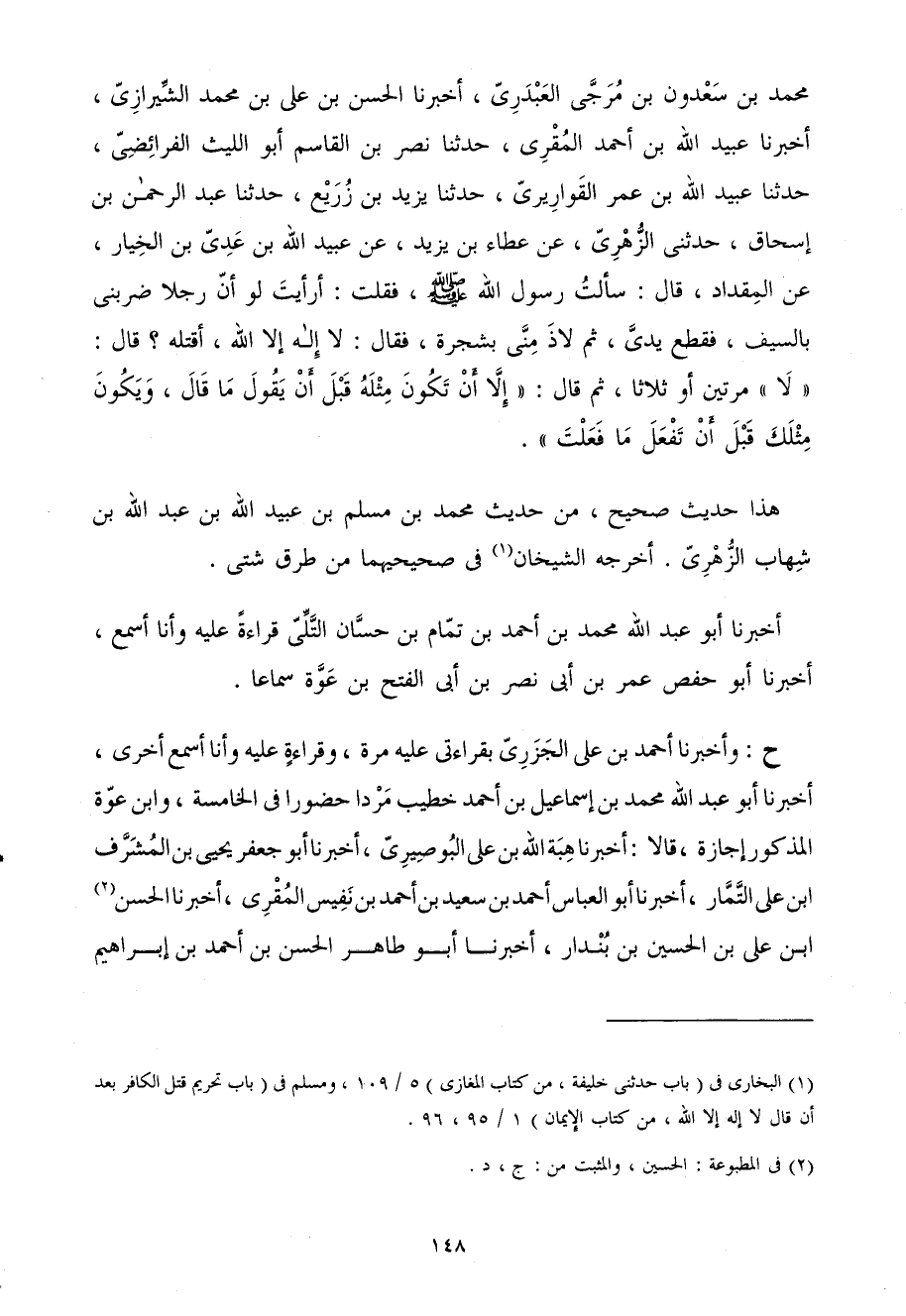 مُحَمَّدِ بْنِ سَعْدُونِ بْنِ مُرَجَّى الْعَبْدَرِيِّ أَخْبَرَنَا الْحَسَنُ بْنُ عَلِيِّ بْنِ مُحَمَّدٍ الشِّيرَازِيُّ أَخْبَرَنَا عُبَيْدُ اللَّهِ بْنُ أَحْمَدَ الْمُقْرِي حَدَّثَنَا نَصْرُ بْنُ الْقَاسِمِ أَبُو اللَّيْثِ الْفَرَائِضِيُّ حَدَّثَنَا عُبَيْدُ اللَّهِ بْنُ عُمَرَ الْقَوَارِيرِيُّ حَدَّثَنَا يَزِيدُ بْنُ زُرَيْعٍ حَدَّثَنَا عَبْدُ الرَّحْمَنِ بْنُ إِسْحَاقَ حَدَّثَنِي الزُّهْرِيُّ عَنْ عَطَاءِ بْنِ يَزِيدَ عَنْ عُبَيْدِ اللَّهِ بْنِ عَدِيِّ بْنِ الْخِيَارِ عَنِ الْمِقْدَادِ قَالَ سَأَلْتُ رَسُولَ اللَّهِ صَلَّى اللَّهُ عَلَيْهِ وَسَلَّمَ فَقُلْتُ أَرَأَيْتَ لَوْ أَنَّ رَجُلا ضَرَبَنِي بِالسَّيْفِ فَقَطَعَ يَدِي ثُمَّ لاذَ مِنِّي بِشَجَرَةٍ فَقَالَ لَا إِلَهَ إِلا اللَّهُ أَقْتُلُهُ قَالَ لَا مَرَّتَيْنِ أَوْ ثَلاثًا ثُمَّ قَالَ إِلا أَنْ تَكُونَ مِثْلَهُ قَبْلَ أَنْ يَقُولَ مَا قَالَ وَيَكُونَ مِثْلَكَ قَبْلَ أَنْ تَفْعَلَ مَا فَعَلْتَ