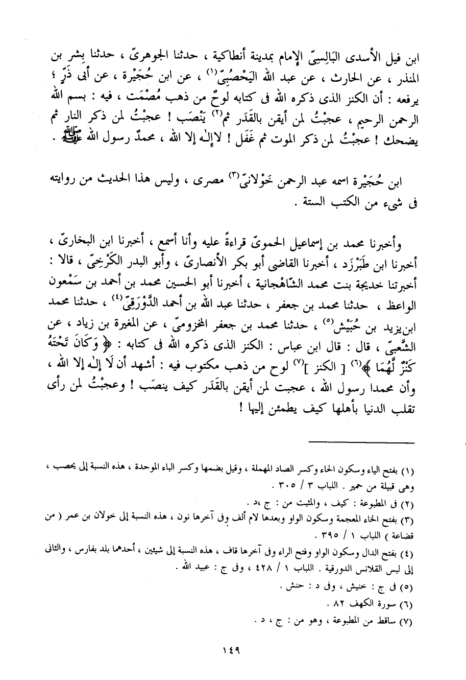 ابْن فِيلٍ الأَسَدِيُّ الْبَالِسِيُّ الإِمَامُ بِمَدِينَةِ أَنْطَاكِيَةَ حَدَّثَنَا الْجَوْهَرِيُّ حَدَّثَنَا بِشْرُ بْنُ الْمُنْذِرِ عَنِ الْحَارِثِ عَنْ عَبْدِ اللَّهِ الْيَحْصِبِيِّ عَنِ ابْنِ حُجَيْرَةَ عَنْ أَبِي ذَرٍّ يَرْفَعُهُ أَنَّ الْكَنْزَ الَّذِي ذَكَرَهُ اللَّهُ فِي كِتَابِهِ لَوْحٌ مِنْ ذَهَبٍ مُصْمَتٍ فِيهِ بِسْمِ اللَّهِ الرَّحْمَنِ الرَّحِيمِ عَجِبْتُ لِمَنْ أَيْقَنَ بِالْقَدَرِ ثُمَّ يَنْصَبُ عَجِبْتُ لِمَنْ ذَكَرَ النَّارَ ثُمَّ يَضْحَكُ عَجِبْتُ لِمَنْ ذَكَرَ الْمَوْتَ ثُمَّ غَفَلَ لَا إِلَهَ إِلا اللَّهُ مُحَمَّد رَسُول الله صلى الله عَلَيْهِ وَسلم