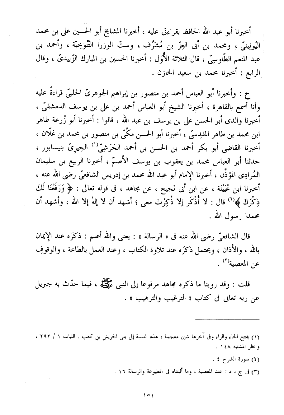 ح وَأَخْبَرَنَا أَبُو الْعَبَّاسِ أَحْمَدُ بْنُ مَنْصُورِ بْنِ إِبْرَاهِيمَ الْجَوْهَرِيُّ الْحَلَبِيُّ قِرَاءَةً عَلَيْهِ وَأَنَا أَسْمَعُ بِالْقَاهِرَةِ أَخْبَرَنَا الشَّيْخُ أَبُو الْعَبَّاسِ أَحْمَدُ بْنُ عَلِيِّ بْنِ يُوسُفَ الدِّمَشْقِيُّ أَخْبَرَنَا وَالِدِي أَبُو الْحَسَنِ عَلِيُّ بْنُ يُوسُفَ بْنِ عَبْدِ الله قَالُوا أخبرنَا أَبُو زرْعَة طَاهِر ابْن مُحَمَّدِ بْنِ طَاهِرٍ الْمَقْدِسِيُّ أَخْبَرَنَا أَبُو الْحَسَنِ مَكِّيُّ بْنُ مَنْصُورِ بْنِ مُحَمَّدِ بْنِ عَلانَ أخبرنَا القَاضِي أَبُو بكر أَحْمد بن الْحسن بْنِ أَحْمَدَ الْحَرَشِيُّ الْحِيرِيُّ بِنَيْسَابُورَ حَدَّثَنَا أَبُو الْعَبَّاسِ مُحَمَّدُ بْنُ يَعْقُوبَ بْنِ يُوسُفَ الأَصَمُّ أَخْبَرَنَا الرَّبِيعُ بْنُ سُلَيْمَانَ الْمُرَادِيُّ الْمُؤَذِّنُ أَخْبَرَنَا الإِمَامُ أَبُو عَبْدِ اللَّهِ مُحَمَّدُ بْنُ إِدْرِيسَ الشَّافِعِيُّ رَضِيَ اللَّهُ عَنْهُ أَخْبَرَنَا ابْنُ عُيَيْنَةَ عَنِ ابْنِ أَبِي نَجِيحٍ عَنْ مُجَاهِدٍ فِي قَوْله تَعَالَى {ورفعنا لَك ذكرك} قَالَ لَا أُذْكَرُ إِلَّا ذُكِرْتَ مَعِي أَشْهَدُ أَن لَا إِلَه إِلَّا الله وَأشْهد أَن مُحَمَّدًا رَسُولُ اللَّهِ