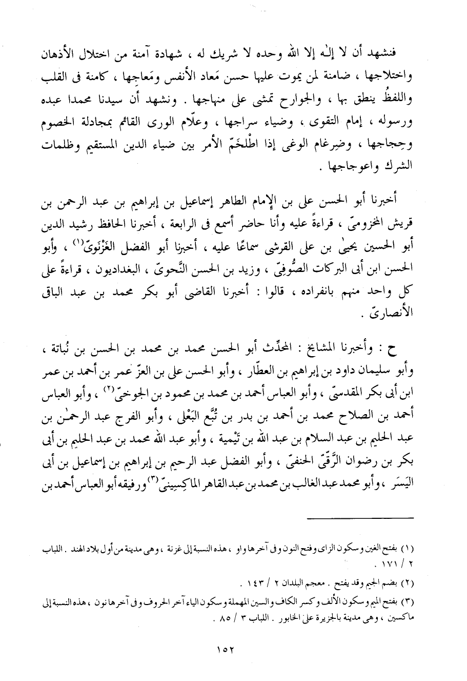 فَنَشْهَدُ أَنْ لَا إِلَهَ إِلا اللَّهُ وَحْدَهُ لَا شَرِيكَ لَهُ شَهَادَةً آمِنَةً مِنَ اخْتِلالِ الأَذْهَانِ وَاخْتِلاجِهَا ضَامِنَةً لِمَنْ يَمُوتُ عَلَيْهَا حُسْنَ مَعَادِ الأَنْفُسِ وَمَعَاجِّهَا كَامِنَةً فِي الْقَلْبِ وَاللَّفْظُ يَنْطِقُ بِهَا وَالْجَوَارِحُ تَمْشِي عَلَى مِنْهَاجِهَا وَنَشْهَدُ أَنَّ سَيِّدَنَا مُحَمَّدًا عَبْدُهُ وَرَسُولُهُ إِمَامُ التَّقْوَى وَضِيَاءُ سِرَاجِهَا وَعَلامُ الْوَرَى الْقَائِمُ بِمُجَادَلَةِ الْخُصُومِ وَحُجَّاجِهَا وَضِرْغَامُ الْوَغَى إِذَا اطْلَخَمَّ الأَمْرُ بَيْنَ ضِيَاء الدِّينِ الْمُسْتَقِيمِ وَظُلُمَاتِ الشِّرْكِ وَاعْوِجَاجِهَا