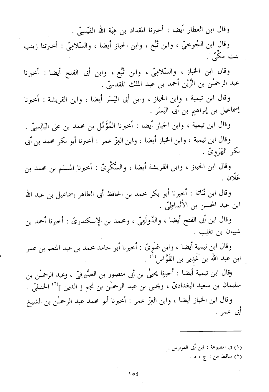 وَقَالَ ابْنُ تَيْمِيَةَ أَيْضًا أَخْبَرَنَا يَحْيَى بْنُ أَبِي مَنْصُورِ بْنِ الصَّيْرَفِيِّ وَعَبْدُ الرَّحْمَنِ بْنُ سُلَيْمَانَ بْنِ سَعِيدٍ الْبَغْدَادِيُّ وَيَحْيَى بْنُ عَبْدِ الرَّحْمَنِ بْنِ نَجْمِ الدِّينِ الْحَنْبَلِيُّ