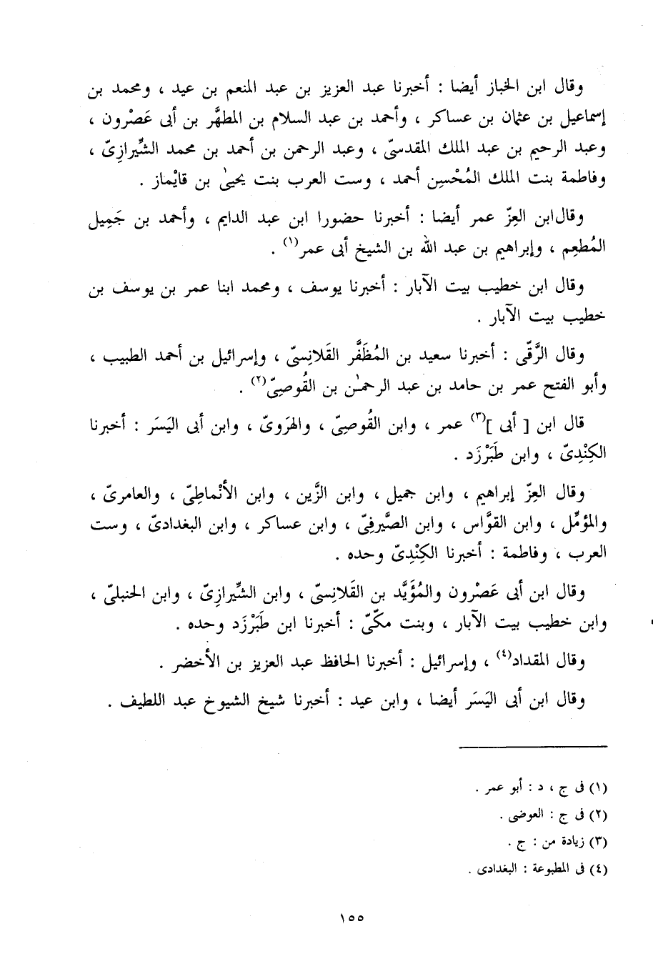 وَقَالَ ابْنُ الْعِزِّ عُمَرُ أَيْضًا أَخْبَرَنَا حُضُورًا ابْنُ عَبْدُ الدَّايِمِ وَأَحْمَدُ بْنُ جَمِيلٍ الْمُطْعِمُ وَإِبْرَاهِيمُ بْنُ عَبْدِ اللَّهِ بن الشَّيْخِ أَبِي عُمَرَ