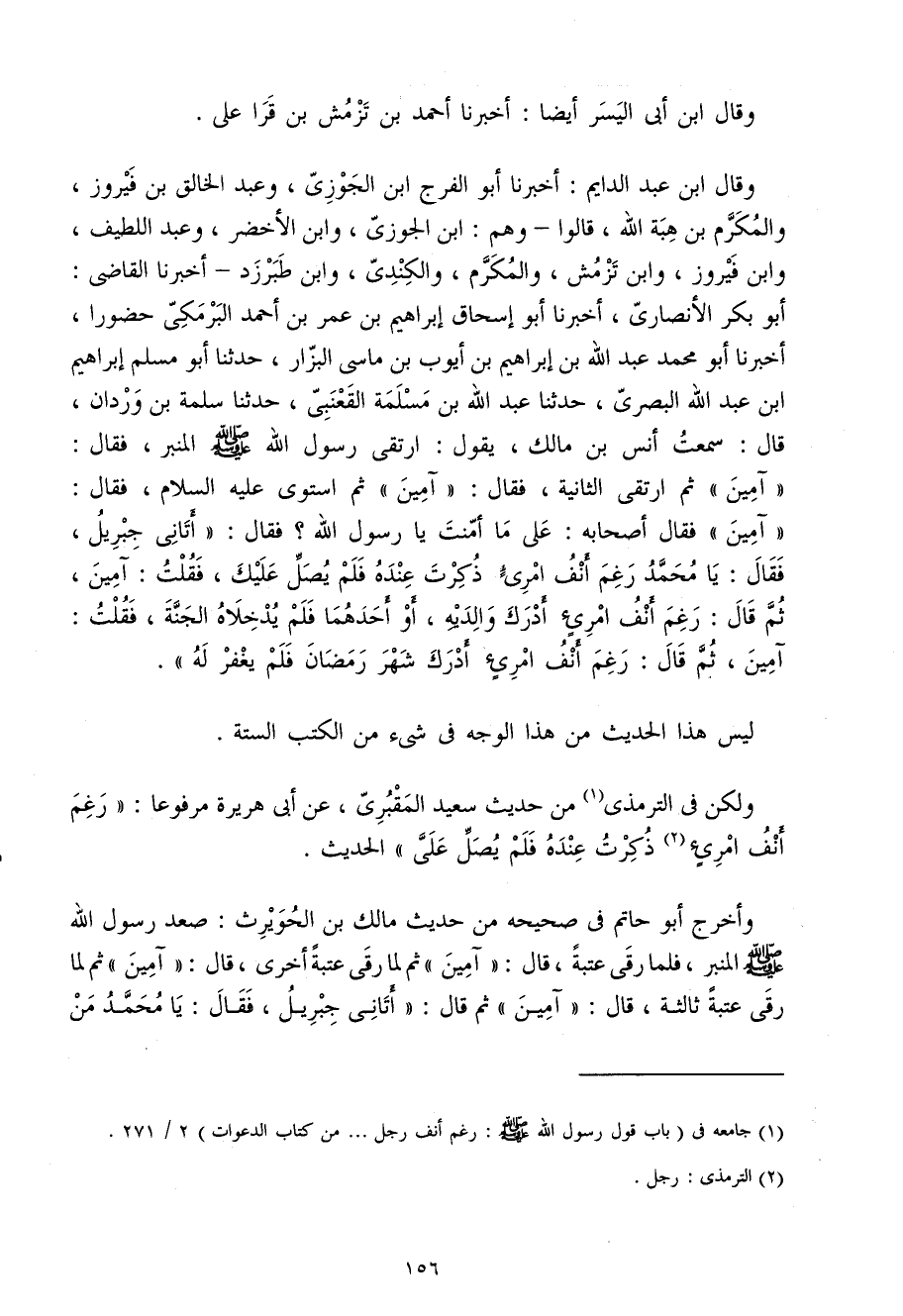 وَقَالَ ابْنُ عبد الدايم أخبرنَا أَبُو الْفرج ابْن الْجَوْزِيِّ وَعَبْدُ الْخَالِقِ بْنُ فَيْرُوزَ وَالْمُكْرَمُ بْنُ هِبَةِ اللَّهِ قَالُوا وَهُمُ ابْنُ الْجَوْزِيِّ وَابْنُ الأَخْضَرِ وَعَبْدُ اللَّطِيفِ وَابْنُ فَيْرُوزَ وَابْنُ تزمش وَالْمُكْرَمُ وَالْكِنْدِيُّ وَابْنُ طَبَرْزَدَ أَخْبَرَنَا الْقَاضِي أَبُو بَكْرٍ الأَنْصَارِيُّ أَخْبَرَنَا أَبُو إِسْحَاقَ إِبْرَاهِيمُ بْنُ عُمَرَ بْنِ أَحْمَدَ الْبَرْمَكِيُّ حُضُورًا أَخْبَرَنَا أَبُو مُحَمَّدٍ عَبْدُ اللَّهِ بْنُ إِبْرَاهِيمَ بْنِ أَيُّوبَ بْنِ مَاسِيٍّ الْبَزَّارُ حَدَّثَنَا أَبُو مُسْلِمٍ إِبْرَاهِيمُ ابْن عَبْدِ اللَّهِ الْبَصْرِيُّ حَدَّثَنَا عَبْدُ اللَّهِ بْنُ مَسْلَمَةَ الْقَعْنَبِيُّ حَدَّثَنَا سَلَمَةُ بْنُ وَرْدَانَ قَالَ سَمِعْتُ أَنَسَ بْنَ مَالِكٍ يَقُولُ ارْتَقَى رَسُولُ اللَّهِ صَلَّى اللَّهُ عَلَيْهِ وَسَلَّمَ الْمِنْبَرَ فَقَالَ آمِينَ ثُمَّ ارْتَقَى الثَّانِيَةَ فَقَالَ آمِينَ ثُمَّ اسْتَوَى عَلَيْهِ السَّلامُ فَقَالَ آمِينَ فَقَالَ أَصْحَابُهُ عَلَى مَا أَمَّنْتَ يَا رَسُولَ اللَّهِ فَقَالَ أَتَانِي جِبْرِيلُ فَقَالَ يَا مُحَمَّدُ رَغِمَ أَنْفُ امريء ذُكِرْتَ عِنْدَهُ فَلَمْ يُصَلِّ عَلَيْكَ فَقُلْتُ آمِينَ ثمَّ قَالَ رغم أنف امرىء أَدْرَكَ وَالِدَيْهِ أَوْ أَحَدَهُمَا فَلَمْ يُدْخِلاهُ الْجَنَّةَ فَقلت آمين ثمَّ قَالَ رغم أنف امريء أَدْرَكَ شَهْرَ رَمَضَانَ فَلَمْ يُغْفَرْ لَهُ