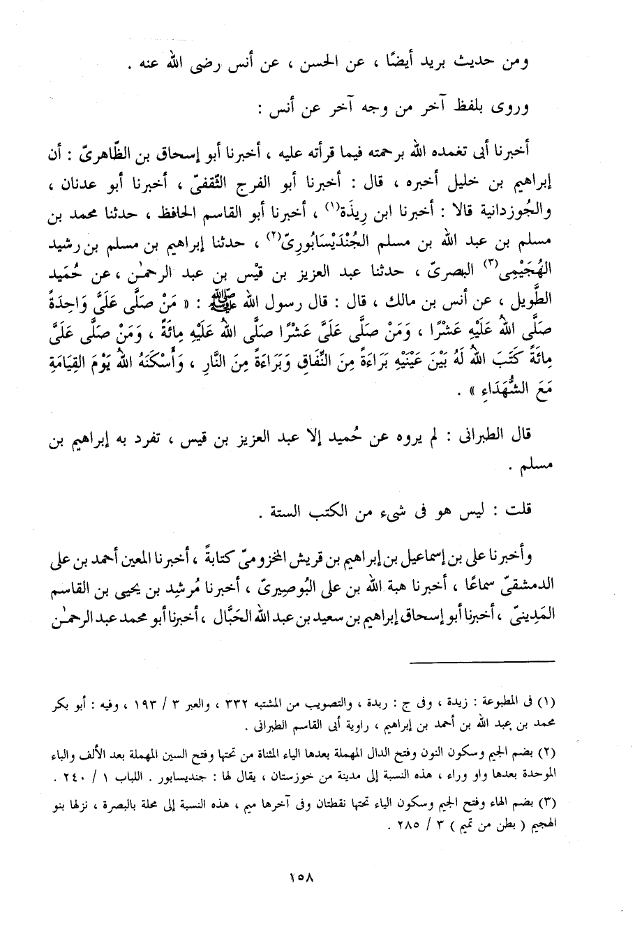 أَخْبَرَنَا أَبِي تَغَمَّدَهُ اللَّهُ بِرَحْمَتَهِ فِيمَا قَرَأْتُهُ عَلَيْهِ أَخْبَرَنَا أَبُو إِسْحَاقَ بْنُ الظَّاهِرِيِّ أَنَّ إِبْرَاهِيمَ بْنَ خَلِيلٍ أَخْبَرَهُ قَالَ أَخْبَرَنَا أَبُو الْفَرَجِ الثَّقَفِيُّ أَخْبَرَنَا أَبُو عَدْنَانَ وَالْجَوْزَدَانِيَّةُ قَالا أَخْبَرَنَا ابْنُ رِيذَةَ أَخْبَرَنَا أَبُو الْقَاسِمِ الْحَافِظُ حَدَّثَنَا مُحَمَّدُ بْنُ مُسْلِمِ بْنِ عَبْدِ اللَّهِ بْنِ مُسْلِمٍ الْجُنْدَيْسَابُورِيُّ حَدَّثَنَا إِبْرَاهِيمُ بْنُ مُسْلِمِ بْنِ رُشَيْدٍ الْهُجَيْمِيُّ الْبَصْرِيُّ حَدَّثَنَا عَبْدُ الْعَزِيزِ بْنُ قَيْسِ بْنِ عَبْدِ الرَّحْمَنِ عَنْ حُمَيْدٍ الطَّوِيلِ عَنْ أَنَسِ بْنِ مَالِكٍ قَالَ قَالَ رَسُولُ اللَّهِ صلى الله عَلَيْهِ وَسلم من صلى عَليّ وَاحِدَةً صَلَّى اللَّهُ عَلَيْهِ عَشْرًا وَمَنْ صَلَّى عَلِيَّ عَشْرًا صَلَّى اللَّهُ عَلَيْهِ مِائَةً وَمَنْ صَلَّى عَلِيَّ مِائَةً كَتَبَ اللَّهُ لَهُ بَيْنَ عَيْنَيْهِ بَرَاءَةً مِنَ النِّفَاقِ وَبَرَاءَةً مِنَ النَّارِ وَأَسْكَنَهُ اللَّهُ يَوْمَ الْقِيَامَةِ مَعَ الشُّهَدَاءِ