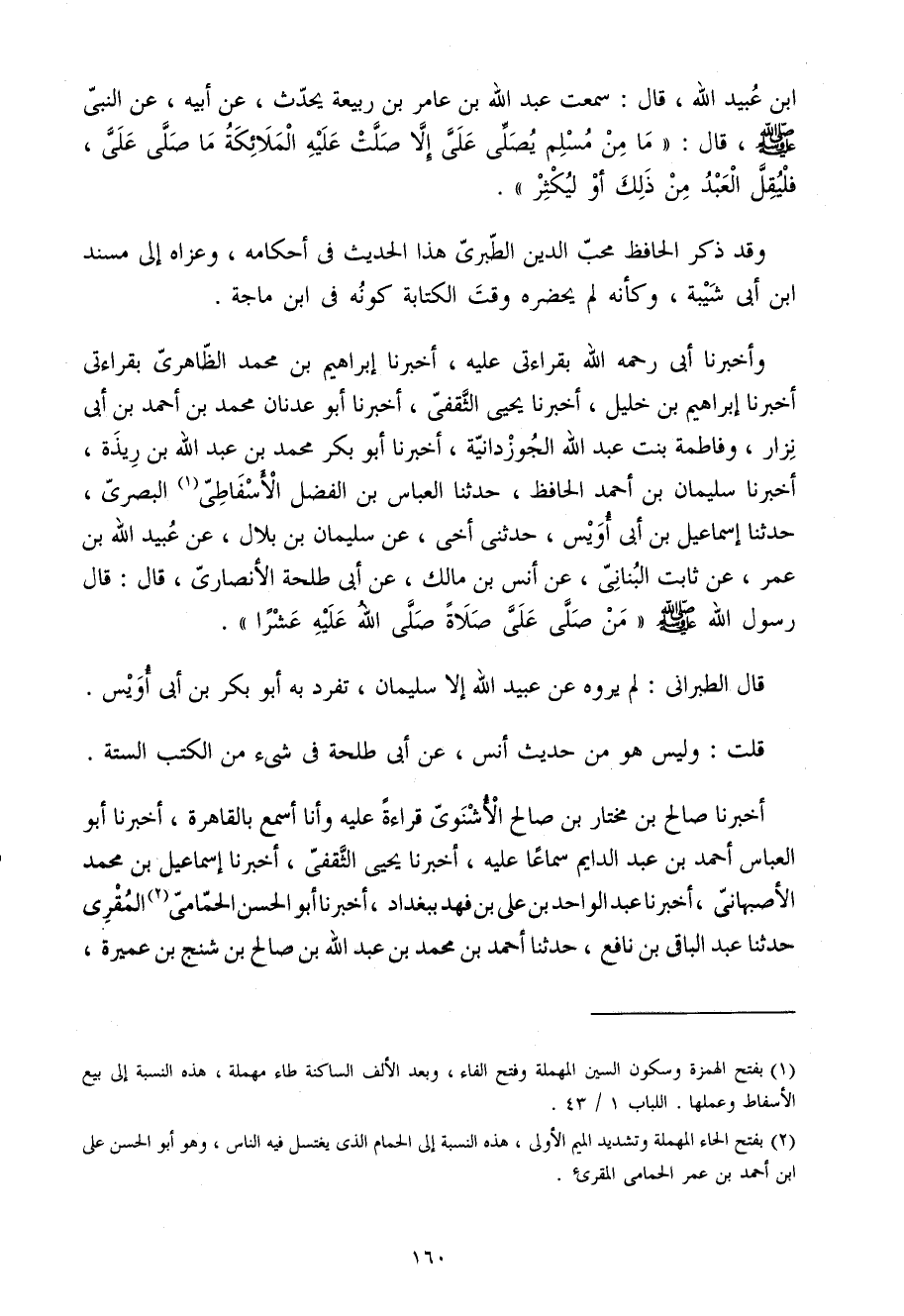 وَأَخْبَرَنَا أَبِي رَحِمَهُ اللَّهُ بِقِرَاءَتِي عَلَيْهِ أَخْبَرَنَا إِبْرَاهِيمُ بْنُ مُحَمَّدٍ الظَّاهِرِيُّ بِقِرَاءَتِي أَخْبَرَنَا إِبْرَاهِيمُ بْنُ خَلِيلٍ أَخْبَرَنَا يَحْيَى الثَّقَفِيُّ أَخْبَرَنَا أَبُو عَدْنَانَ مُحَمَّدُ بْنُ أَحْمَدَ بْنِ أَبِي نِزَارٍ وَفَاطِمَةُ بِنْتُ عَبْدِ اللَّهِ الْجَوْزَدَانِيَّةُ أَخْبَرَنَا أَبُو بَكْرٍ مُحَمَّدُ بْنُ عَبْدِ اللَّهِ بْنِ رِيذَةَ أَخْبَرَنَا سُلَيْمَانُ بْنُ أَحْمَدَ الْحَافِظُ حَدَّثَنَا الْعَبَّاسُ بْنُ الْفَضْلِ الأَسْفَاطِيُّ الْبَصْرِيُّ حَدَّثَنَا إِسْمَاعِيلُ بْنُ أَبِي أُوَيْسٍ حَدَّثَنِي أَخِي عَنْ سُلَيْمَانَ بْنِ بِلالٍ عَنْ عُبَيْدِ اللَّهِ بْنِ عُمَرَ عَنْ ثَابِتٍ الْبُنَانِيِّ عَنْ أَنَسِ بْنِ مَالِكٍ عَنْ أَبِي طَلْحَةَ الأَنْصَارِيِّ قَالَ قَالَ رَسُولُ اللَّهِ صلى الله عَلَيْهِ وَسلم من صلى عَليّ صَلاةً صَلَّى اللَّهُ عَلَيْهِ عَشْرًا