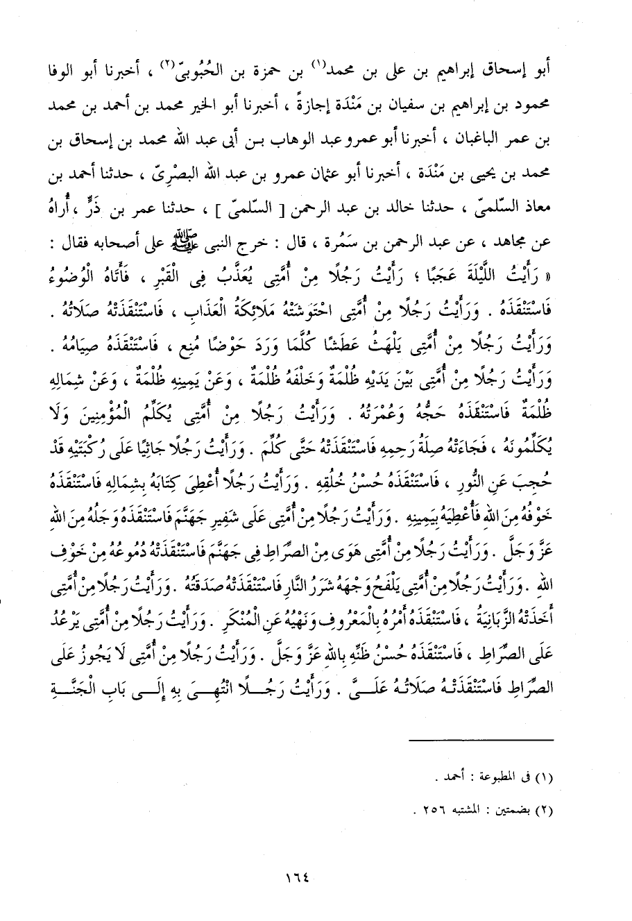 أَبُو إِسْحَاقَ إِبْرَاهِيمُ بْنُ عَلِيِّ بْنِ مُحَمَّدِ بْنِ حَمْزَةَ بْنِ الْحُبُوبِيِّ أَخْبَرَنَا أَبُو الْوَفَا مَحْمُود بن إِبْرَاهِيم بن سُفْيَان بن مَنْدَه إِجَازَةً أَخْبَرَنَا أَبُو الْخَيْرِ مُحَمَّدُ بْنُ أَحْمَدَ بْنِ مُحَمَّدِ بْنِ عُمَرَ الْبَاغْبَانُ أَخْبَرَنَا أَبُو عَمْرو عبد الْوَهَّاب بن أبي عبد الله مُحَمَّدِ بْنِ إِسْحَاقَ بْنِ مُحَمَّدِ بْنِ يَحْيَى بْنِ مَنْدَهْ أَخْبَرَنَا أَبُو عُثْمَانَ عَمْرُو بْنُ عَبْدِ اللَّهِ الْبَصْرِيُّ حَدَّثَنَا أَحْمَدُ بْنُ مُعَاذٍ السُّلَمِيُّ حَدَّثَنَا خَالِدُ بْنُ عَبْدِ الرَّحْمَنِ السُّلَمِيُّ حَدَّثَنَا عُمَرُ بْنُ ذَرٍّ أَرَاهُ عَنْ مُجَاهِدٍ عَنْ عَبْدِ الرَّحْمَنِ بْنِ سَمُرَةَ قَالَ خَرَجَ النَّبِيُّ صَلَّى اللَّهُ عَلَيْهِ وَسَلَّمَ عَلَى أَصْحَابِهِ فَقَالَ رَأَيْتُ اللَّيْلَةَ عَجَبًا رَأَيْتُ رَجُلا مِنْ أُمَّتِي يُعَذَّبُ فِي الْقَبْرِ فَأَتَاهُ الْوُضُوءُ فَاسْتَنْقَذَهُ وَرَأَيْتُ رَجُلا مِنْ أُمَّتِي احْتَوَشَتْهُ مَلائِكَةُ الْعَذَابِ فَاسْتَنْقَذَتْهُ صَلاتُهُ وَرَأَيْتُ رَجُلا مِنْ أُمَّتِي يَلْهَثُ عَطَشًا كُلَّمَا وَرَدَ حَوْضًا مُنِعَ فَاسْتَنْقَذَهُ صِيَامُهُ وَرَأَيْتُ رَجُلا مِنْ أُمَّتِي بَيْنَ يَدَيْهِ ظُلْمَةٌ وَخَلْفَهُ ظُلْمَةٌ وَعَنْ يَمِينِهِ ظُلْمَةٌ وَعَنْ شِمَالِهِ ظُلْمَةٌ فَاسْتَنْقَذَهُ حَجُّهُ وَعُمْرَتُهُ وَرَأَيْتُ رَجُلا مِنْ أُمَّتِي يُكَلِّمُ الْمُؤْمِنِينَ وَلا يُكَلِّمُونَهُ فَجَاءَتْهُ صِلَةُ رَحِمِهِ فَاسْتَنَقْذَتْهُ حَتَّى كُلِّمَ وَرَأَيْتُ رَجُلا جَاثِيًا عَلَى رُكْبَتَيْهِ قَدْ حُجِبَ عَنِ النُّورِ فَاسْتَنْقَذَهُ حُسْنُ خُلُقِهِ وَرَأَيْتُ رَجُلا أُعْطِيَ كِتَابَهُ بِشِمَالِهِ فَاسْتَنْقَذَهُ خَوْفُهُ مِنَ اللَّهِ فَأُعْطِيهِ بِيَمِينِهِ وَرَأَيْتُ رَجُلا مِنْ أُمَّتِي عَلَى شَفِيرِ جَهَنَّمَ فَاسْتَنْقَذَهُ وَجَلُهُ مِنَ اللَّهِ عَزَّ وَجَلَّ وَرَأَيْتُ رَجُلا مِنْ أُمَّتِي هَوَى مِنَ الصِّرَاطِ فِي جَهَنَّمَ فَاسْتَنْقَذَتْهُ دُمُوعُهُ مِنْ خَوْفِ اللَّهِ وَرَأَيْتُ رَجُلا مِنْ أُمَّتِي يَلْفَحُ وَجْهَهُ شَرَرُ النَّارِ فَاسْتَنْقَذَتْهُ صَدَقَتُهُ وَرَأَيْتُ رَجُلا مِنْ أُمَّتِي أَخَذَتْهُ الزَّبَانِيَةُ فَاسْتَنْقَذَهُ أَمْرُهُ بِالْمَعْرُوفِ وَنَهْيُهُ عَنِ الْمُنْكَرِ وَرَأَيْتُ رَجُلا مِنْ أُمَّتِي يَرْعَدُ عَلَى الصِّرَاطِ فَاسْتَنْقَذَهُ حُسْنُ ظَنِّهِ بِاللَّهِ عَزَّ وَجَلَّ وَرَأَيْتُ رَجُلا مِنْ أُمَّتِي لَا يَجُوزُ عَلَى الصِّرَاطِ فَاسْتَنْقَذَتْهُ صَلاتُهُ عَلَى وَرَأَيْتُ رَجُلا انْتُهِيَ بِهِ إِلَى بَاب الْجنَّة